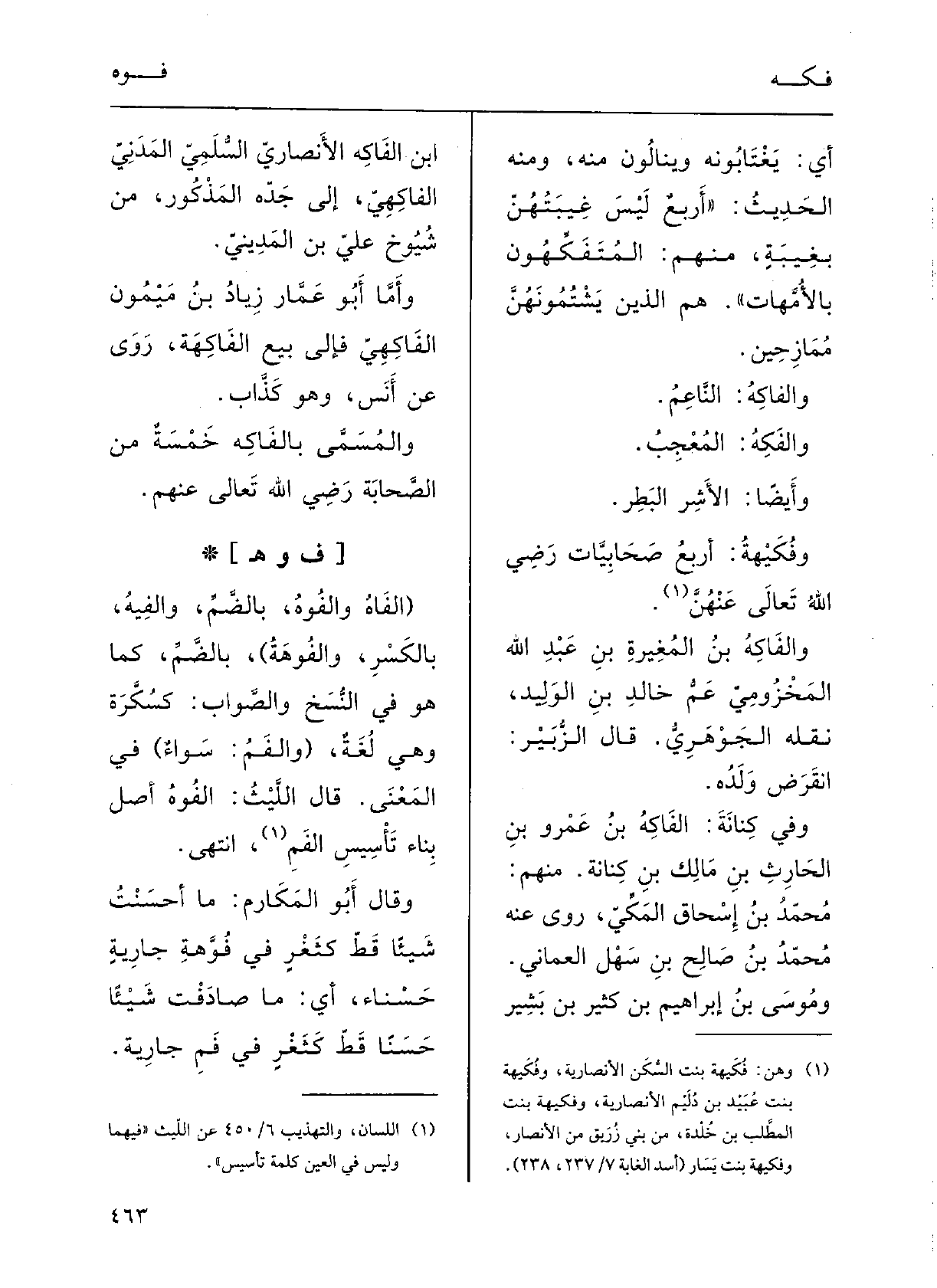 وَفِي كِنَانَةَ: الفَاكِهُ بْنُ عَمْرُو بنِ الحَرِثِ بنِ مَالِكِ ابنِ كِنَانَة، مِنْهُمْ: محمدُ بْنُ إِسْحَق المَكِّيُّ. رَوَى عَنْهُ محمدُ بْنُ صَالِحِ بْنِ سَهْلٍ العمانيُّ، وَمُوسَى بْنُ إِبْرَاهِيمَ بنِ كَثِيرِ بنِ بَشيرِ بنِ الفَاكِهِ الأَنْصَارِيُّ السُّلَمِيُّ المدنيُّ الفاكِهِيُّ إِلَى جَدِّهِ المَذْكُور، من شُيُوخِ عليَ بن المَدِينِي.