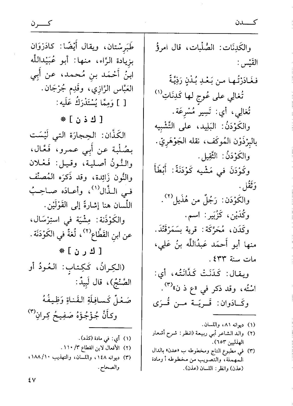 :) الكَذَّانُ: الحِجَارَةُ الَّتِي ليسَتْ بصُلْبَةٍ؛ عَن أَبي عَمْرٍ و؛ فَعَّالٌ والنونُ أَصْليَّة، وقيلَ: فَعْلان والنونُ زائِدَةٌ؛ وَقد ذَكَرَه المصنِّفُ فِي الذالِ، وأَعادَهُ صاحِبُ اللِّسانِ هُنَا إشارَةً إِلَى القَوْلَيْن.