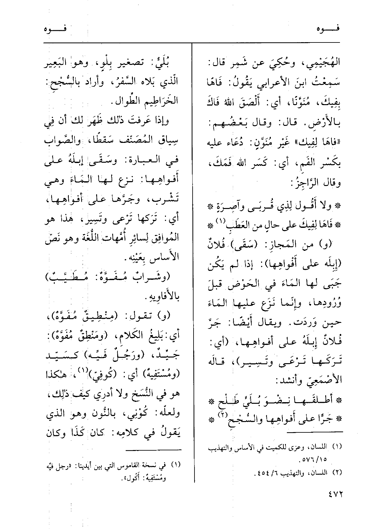 وَلَا أَقولُ لذِي قُرْبَى وآصِرةٍ فاها لِفِيكَ على حالٍ من العَطَبِ (و) مِن المجازِ: (سَقَى) فلانٌ (إِبِلَهُ على {أَفْواهِها) ، إِذا لم يكنْ جَبَى لَهَا الماءَ فِي الحوْضِ قَبْل وُرُودِها، وإنَّما نَزَعَ عَلَيْهَا الماءَ حِين وَرَدَتْ.