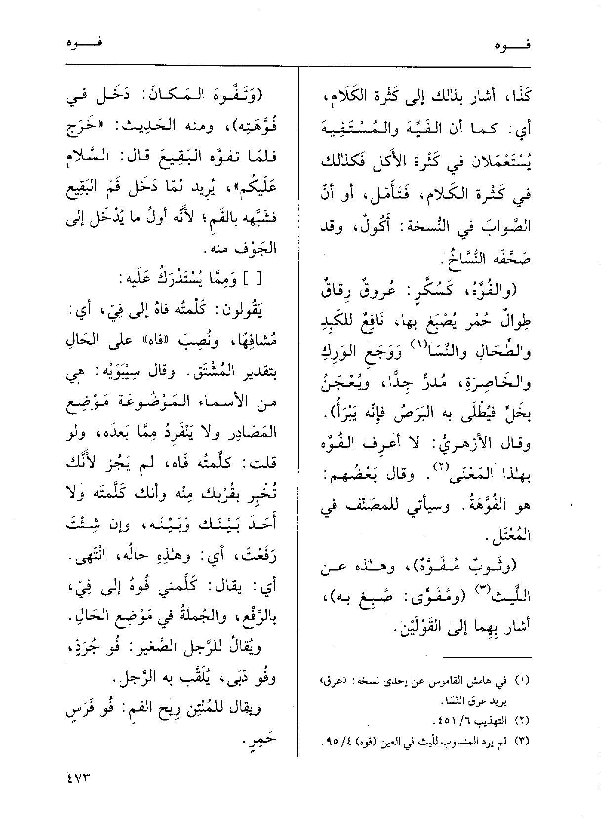 (} وتَفَوَّهَ المَكانَ: دخَلَ فِي {فُوَّهَتِه) ؛) وَمِنْه الحدِيثُ: خَرَجَ فَلَمَّا} تَفَوَّهَ البَقِيعَ قالَ: (السلامُ عَلَيْكم) ؛ يُريدُ لما دَخَلَ فمَ البَقِيعِ، فشَبَّهَه {بالفَمِ لأنَّه أَوَّل مَا يُدْخَل إِلَى الجَوْفِ مِنْهُ.