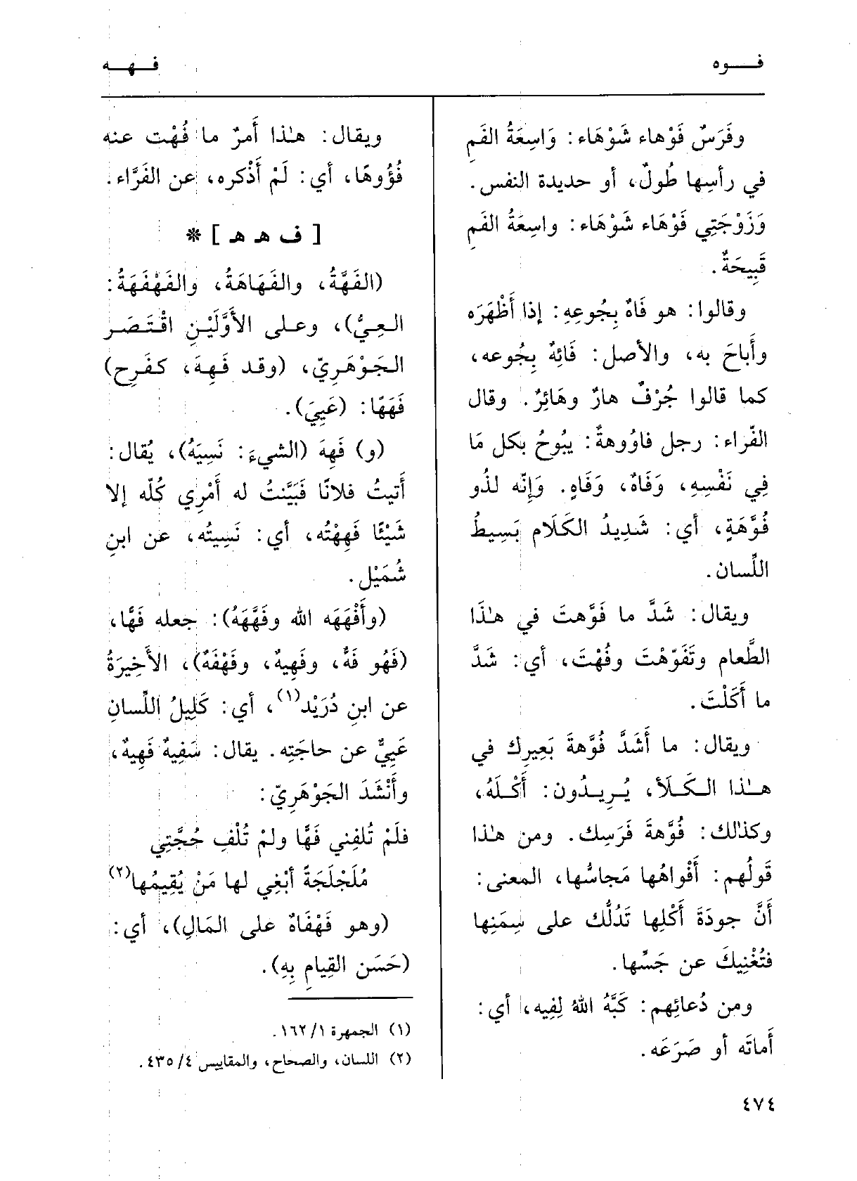 ويقالُ: هَذَا أَمْرٌ مَا {فُهْت عَنهُ} فُؤُوها، أَي لم أَذْكُرْه؛ عَن الفرَّاء.