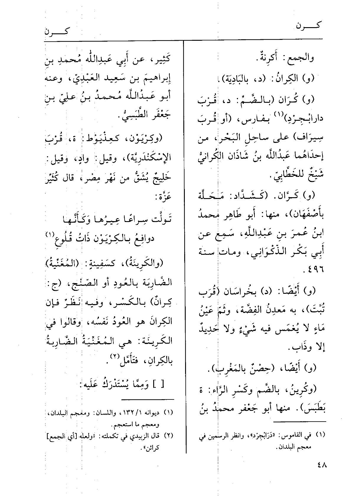 (وكُرانُ، (بالضَّمِّ: د قُرْبَ دَارَا بْجِرْدَ بفارِسَ (أَو قُرْبَ سِيرافَ على ساحِلِ البَحْرِ؛ مِن إحْداهما عبدُ اللهِ بنُ شاذَانَ الكُرانيُّ شيخٌ للخطابيِّ.