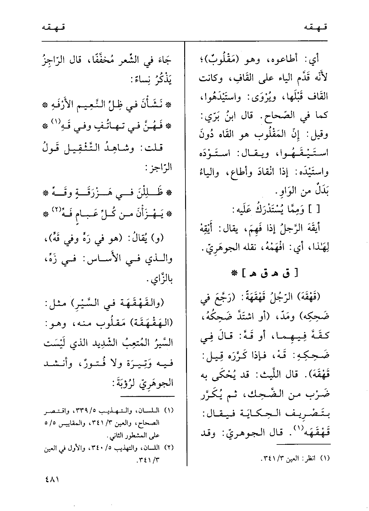 نَشَأْنَ فِي ظِلِّ النَّعيمِ الأَرْفَهِفهُنَّ فِي تَهاتُفٍ وَفِي} قَهِ قُلْتُ: وشاهِدُ التَّثْقِيلِ قَوْلُ الراجزِ:
