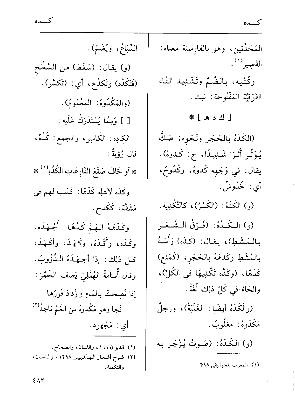 الكادِهُ: الكاسِرُ؛ والجَمْعُ كُدَّهٌ؛ قالَ رُؤْبَة: