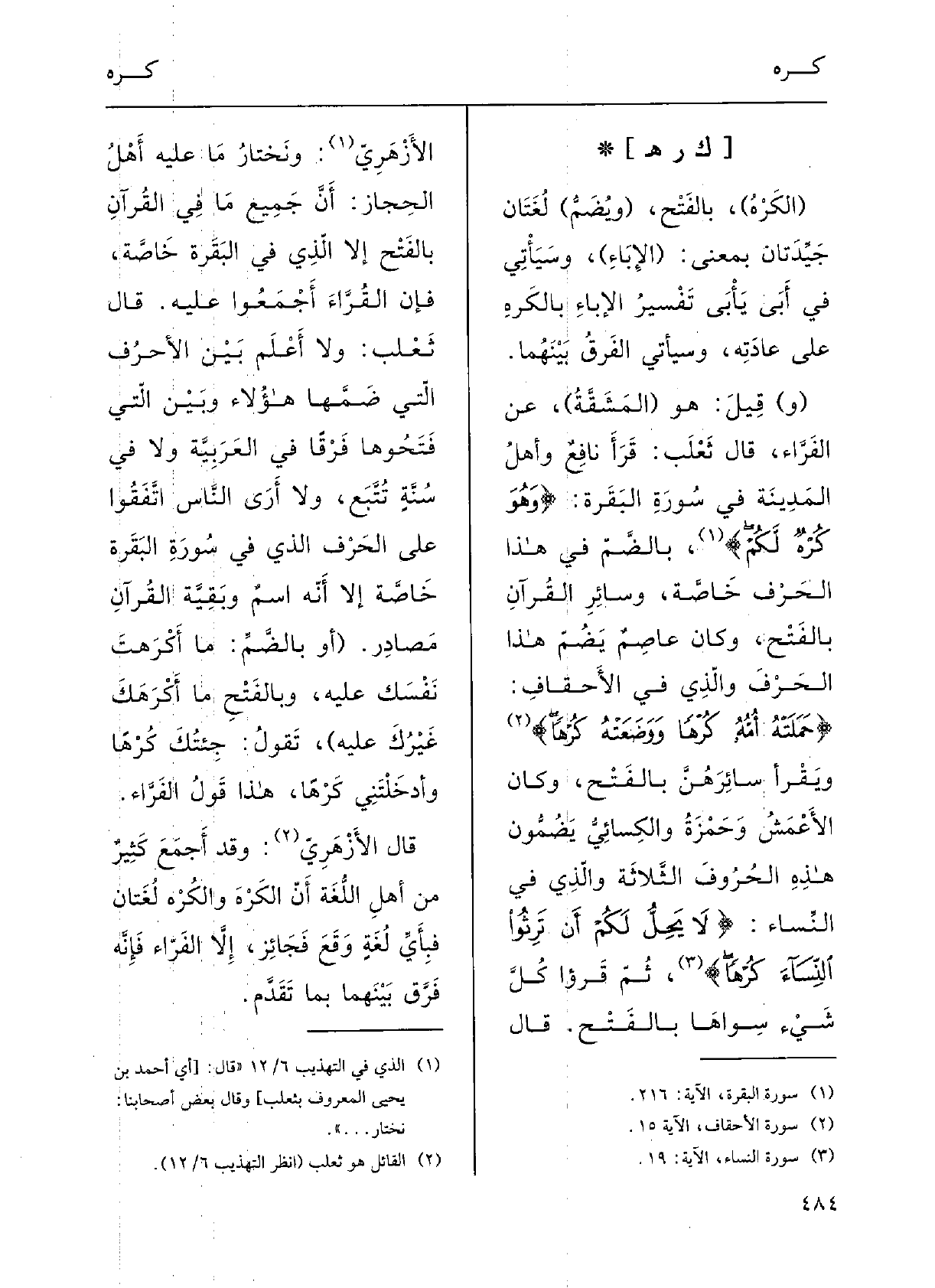 قالَ ثَعْلَب: قَرَأَ نافِعٌ وأَهْلُ المَدينَةِ فِي سُورَةِ البَقَرةِ {وَهُوَ كُرْهٌ لكُم} ، بالضَّمِّ فِي هَذَا الحَرْفِ خاصَّةً، وسائِر القُرْآنِ بالفتْحِ، وكانَ عاصِمُ يَضُمُّ هَذَا الحَرْفَ وَالَّذِي فِي الأحْقافِ: {حَمَلَتْه أُمُّه كُرْهاً ووضَعَتْه كُرْهاً} ، ويَقْرأُ سائِرَهُنَّ بالفتْحِ.