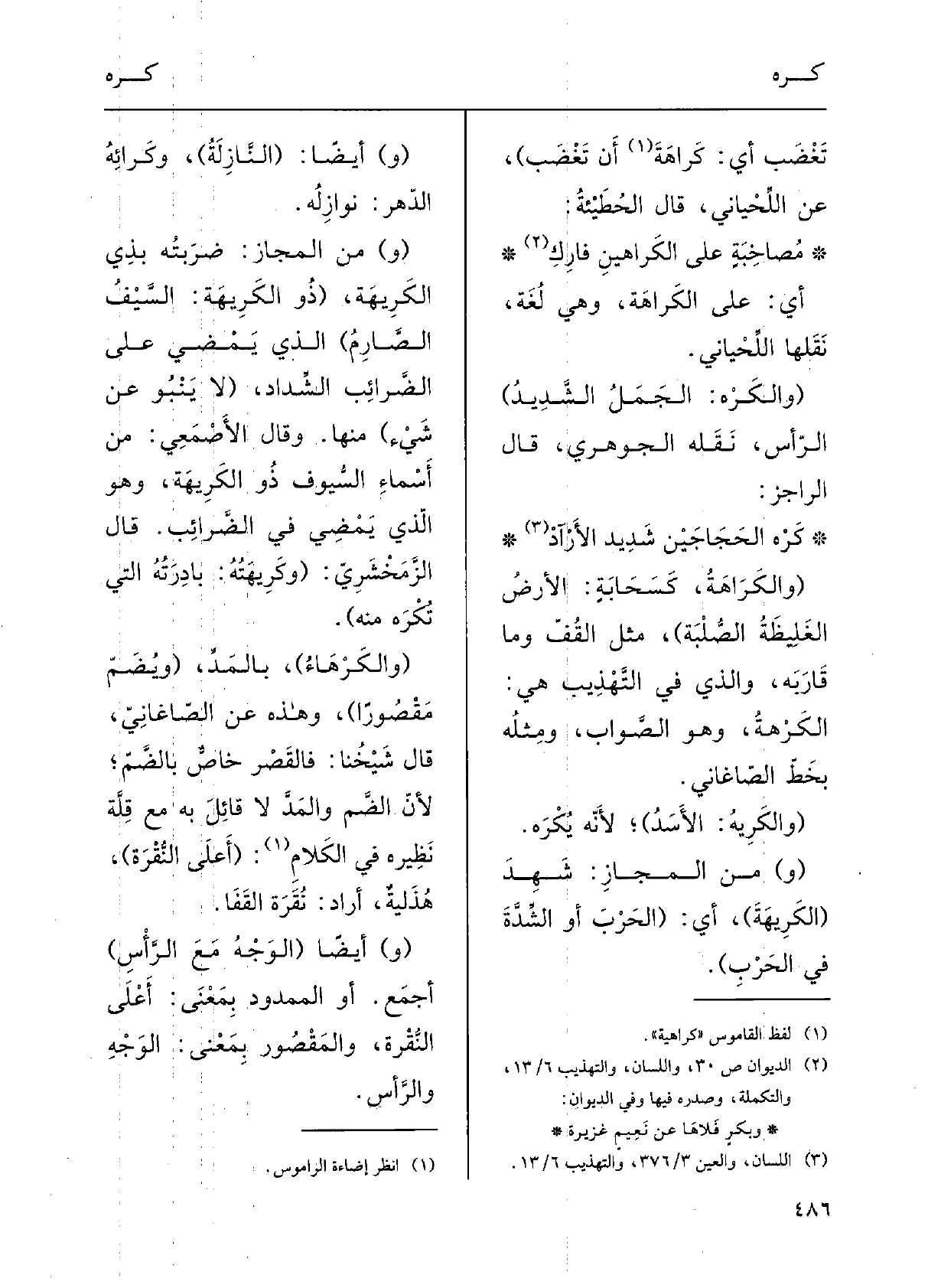 وَالَّذِي فِي التهْذِيبِ: هِيَ الكَرْهَةُ، وَهُوَ الصَّوابُ، ومثْلُه بخطِّ الصَّاغانيّ.