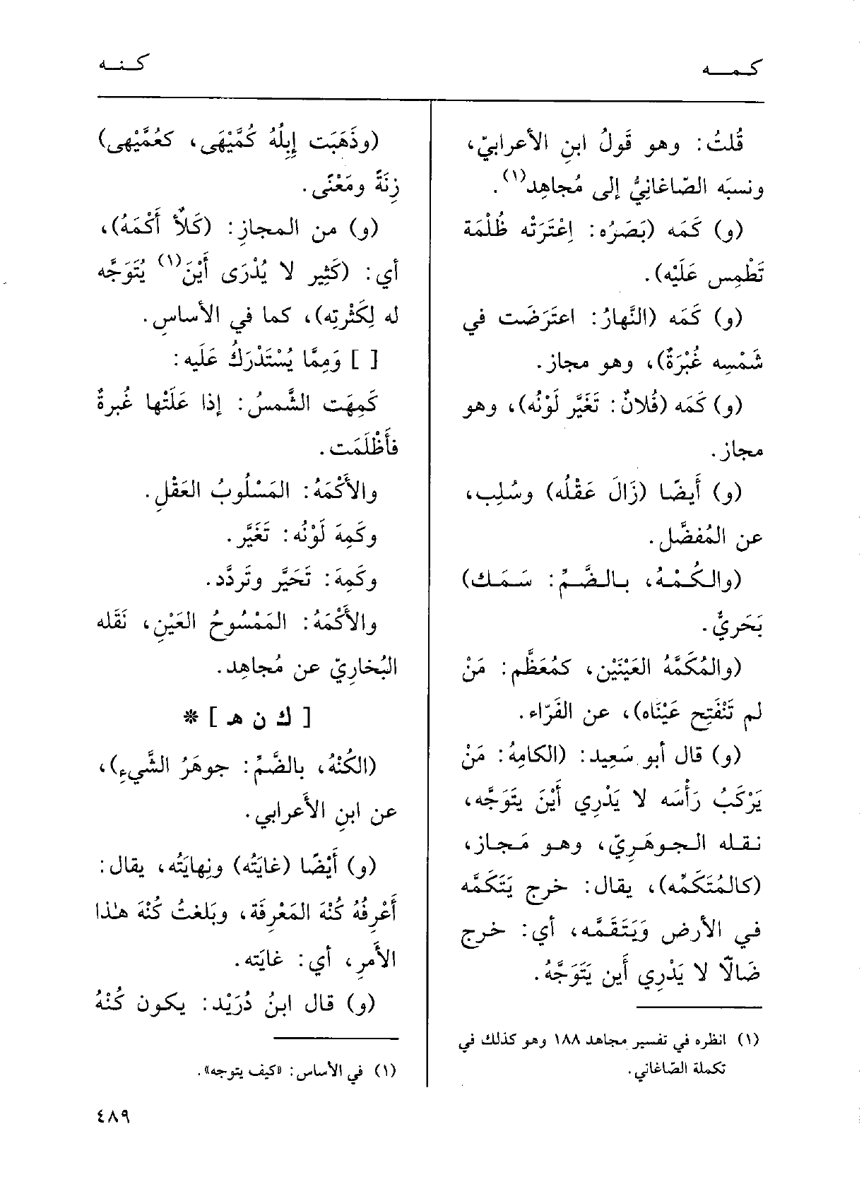 (و) مِن المجازِ: (كَلَلأٌ أَكْمَهُ) :) أَي (كثيرٌ لَا يُدْرَى أَيْنَ يُتَوَجَّهُ لَهُ لِكَثْرَتِهِ) ؛) كَمَا فِي الأساسِ.