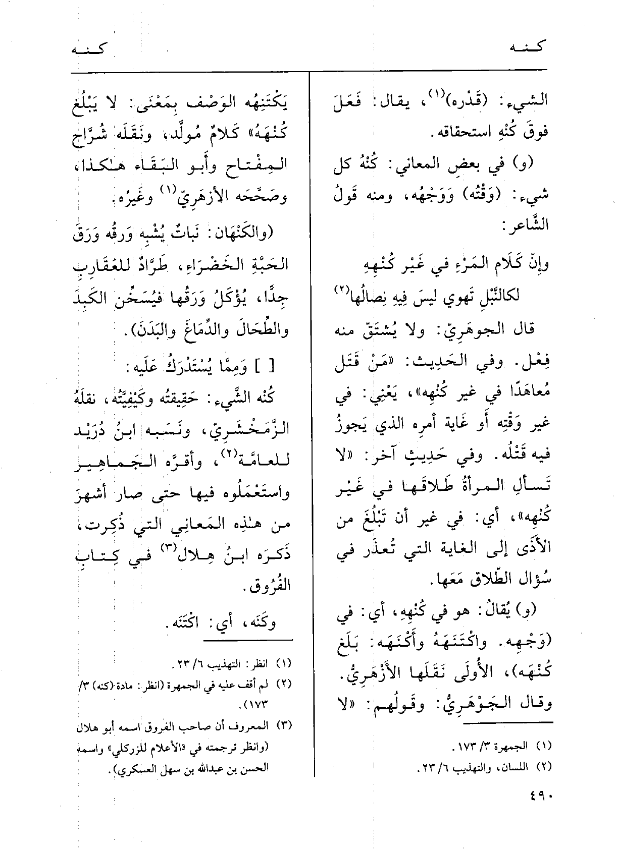 كُنْهُ الشيءِ: حَقيقَتُهُ وكَيْفيَّتُهُ؛ نَقَلَهُ الزَّمَخْشريُّ.