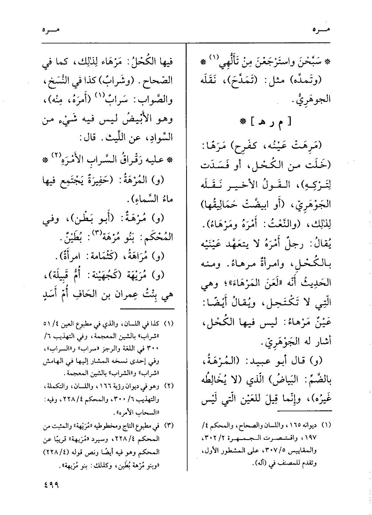 : (مَرِهَتْ عَيْنُه، كفَرِحَ) ، مَرَهاً: (خَلَتْ مِنَ الكُحْلِ، أَو فَسَدَتْ لتَرْكِهِ) ؛) القَوْلُ الأَخيرُ نَقَلَهُ الجوْهرِيُّ.