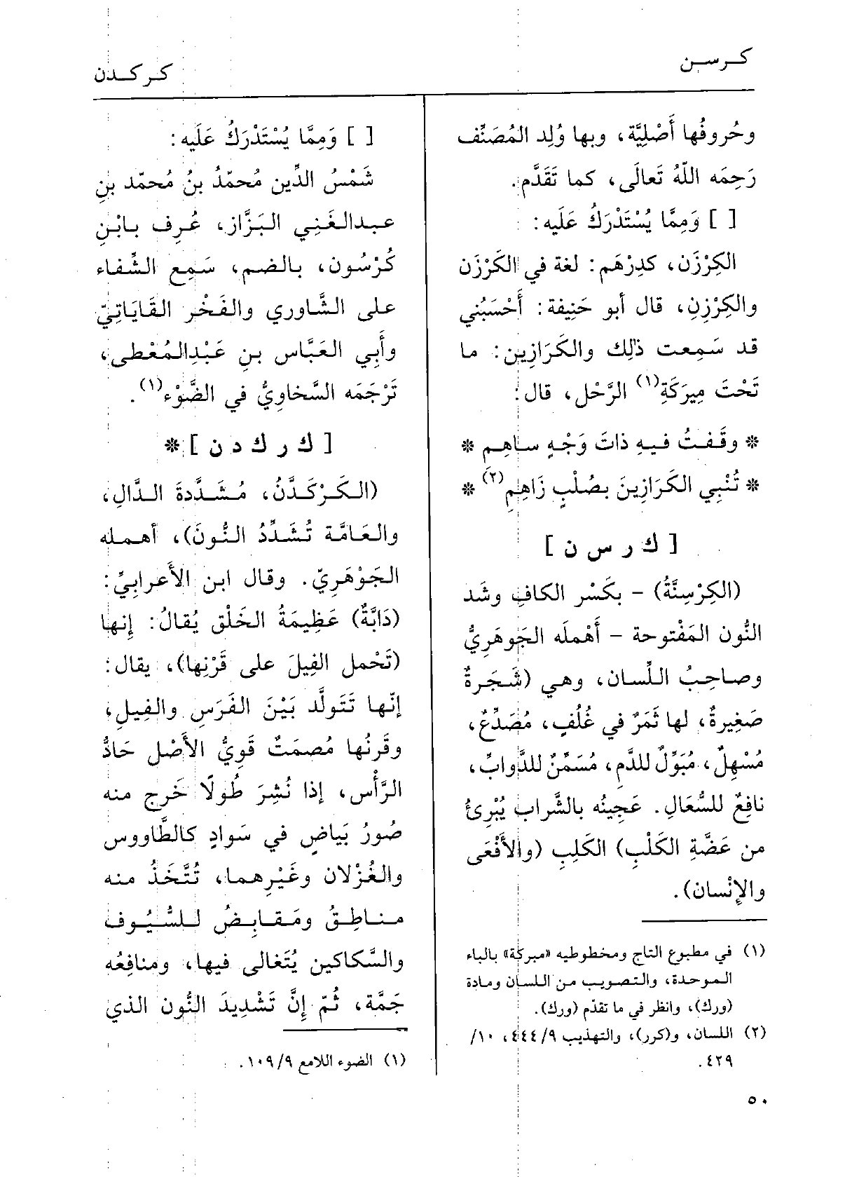 : (الكَرْكَدَّنُ، مُشَدَّدَةَ الَّدالِ والعامَّةُ تُشَدِّدُ النُّون: