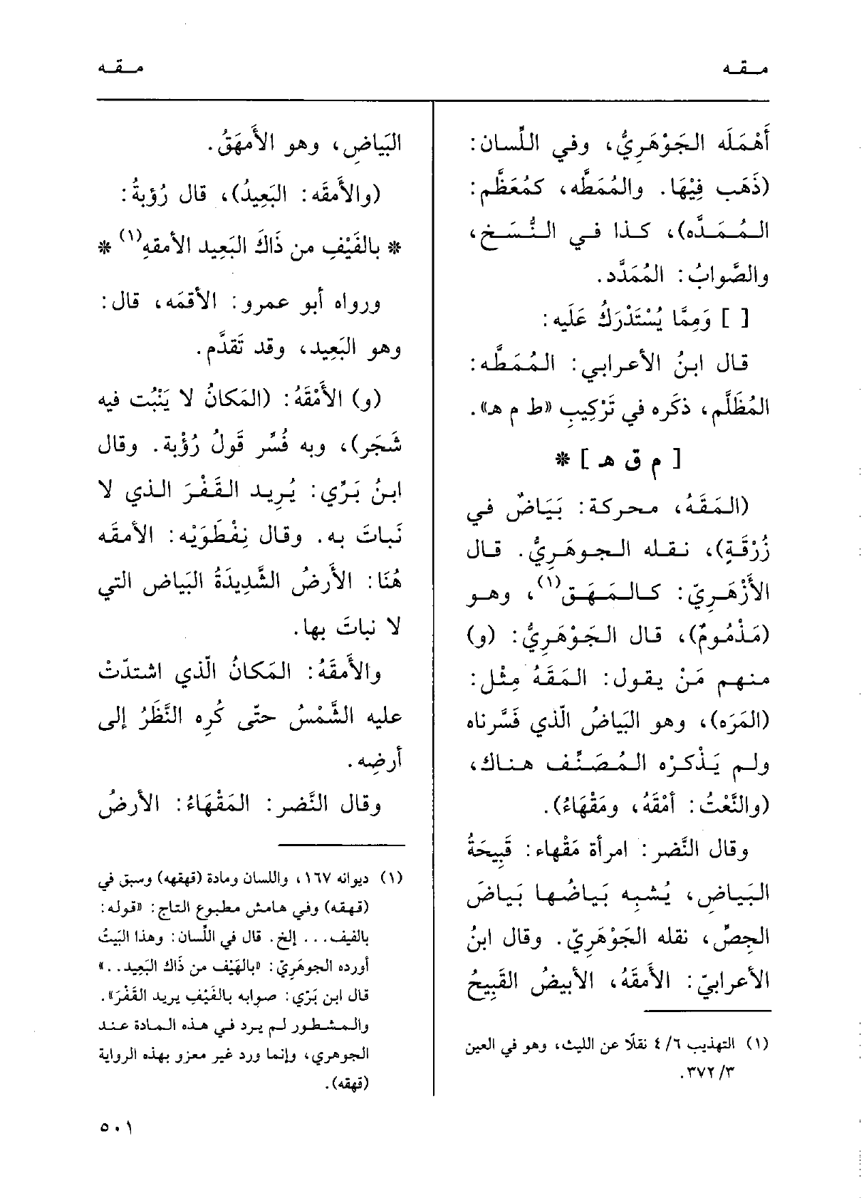 وقالَ نَفْطَويه: الأَمْقَهُ هُنَا الأَرضُ الشَّديدَةُ البَياضِ الَّتِي لَا نَباتَ بهَا؛ والأَمْقَهُ: المَكانُ الَّذِي اشْتَدَّتْ عَلَيْهِ الشمسُ حَتَّى كُرِهَ النَّظرُ إِلَى أَرْضِهِ.