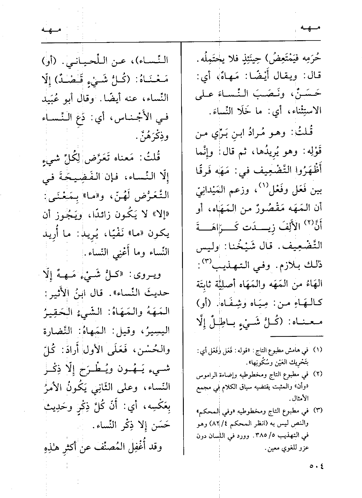قالَ: ويقالُ أَيْضاً: {مَهاهٌ أَي حَسَنٌ، ونَصَبَ النِّساءَ على الاسْتِثْناءِ أَي مَا خَلاَ النِّساءَ.