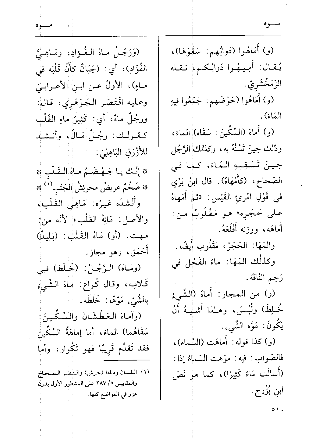 قالَ: ورجُلٌ ماهٌ: أَي كثيرُ ماءِ القَلْبِ، كقَوْلِكَ رجُلٌ مالٌ؛ وأَنْشَدَ للأَزْرَق الباهِلِيّ: