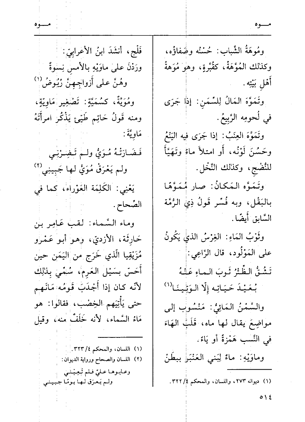 تَشُقُّ الظِّئْر ثَوْبَ الماءِ عَنهُ بُعَيْدَ حياتِه إِلَّا الْوَتِيناوالسَّمْنُ المائِيُّ: مَنْسوبٌ إِلَى مَوَاضِع يقالُ لَهَا مَاهُ؛ قُلِبَ الهاءُ فِي النَّسَبِ هَمْزةً أَو يَاء.