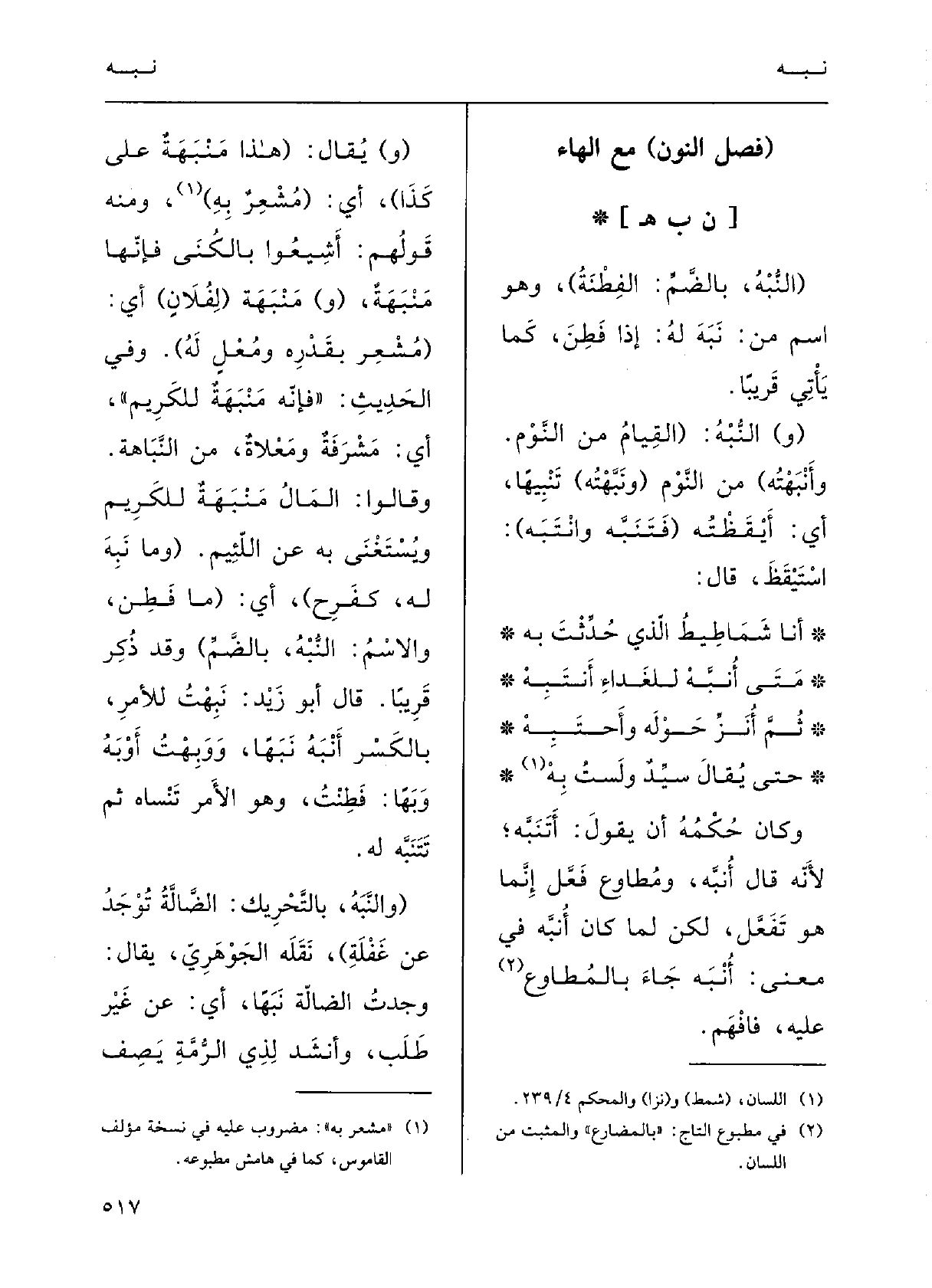: (النُّبْهُ، بالضَّمِّ: الفِطْنَةُ) ؛) وَهُوَ اسمٌ من نَبِهَ لَهُ إِذا فَطِنَ، كَمَا يأْتي قَرِيباً.