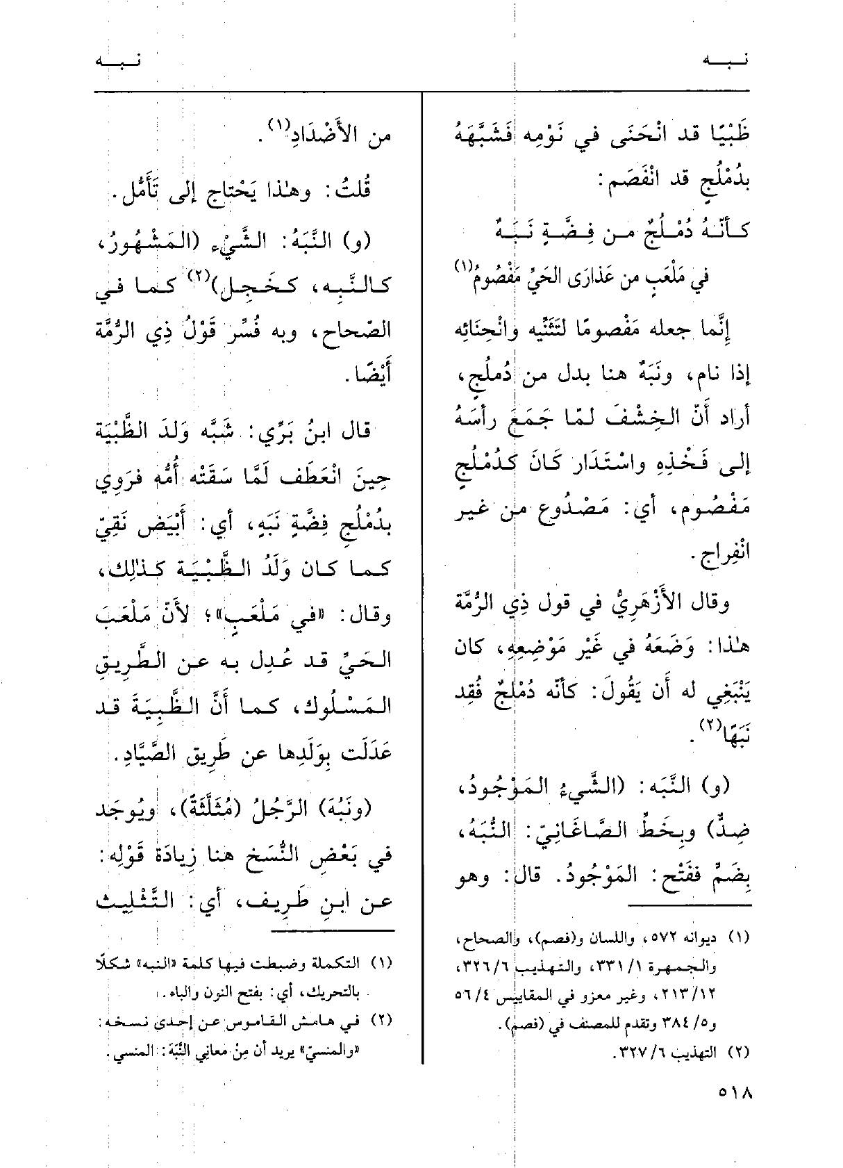 (وبخطّ الصَّاغانيّ: النُّبَهُ، بضمٍ ففتحٍ: المَوْجودُ؛ قالَ: وَهُوَ مِن الأضْدادِ.