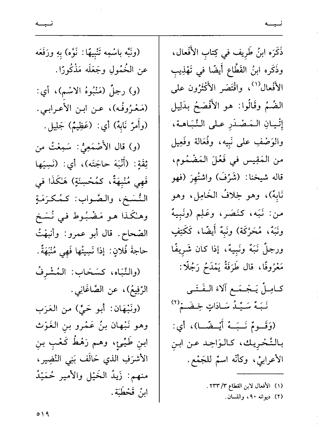ذَكَرَه ابنُ طُريفٍ فِي كتابِ الأفْعالِ، وذَكَرَه ابنُ القطَّاعِ أَيْضاً فِي تَهْذيبِ الأفْعالِ؛ واقْتَصَرَ الأكْثَرُونَ على الضمِّ وَقَالُوا: هُوَ الأفْصَحُ بدَلِيلِ إتْيانِ المَصْدَرِ على النَّباهَةِ والوَصْفِ على نَبِيهٍ وفعالة وفعيل من المقيسِ فِي فعل المَضْمُومِ، قالَهُ شيْخُنا؛ (شَرُفَ) واشْتَهَرَ (فَهُوَ نابِهٌ) ، وَهُوَ خِلافُ الخامِلِ، وَهُوَ من نَبَِهَ، كنَصَرَ وعَلِمَ.