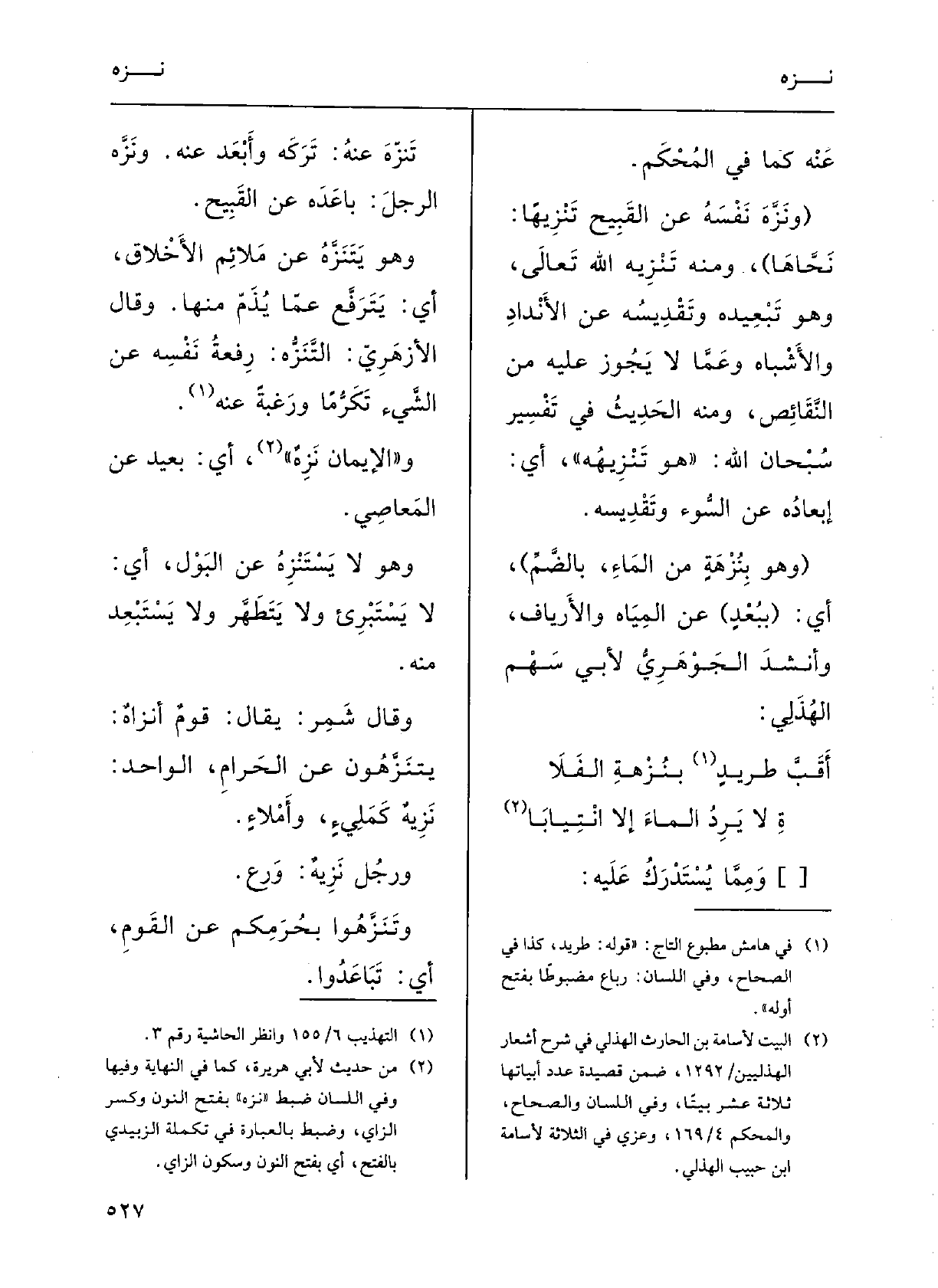 وقالَ شَمِرٌ: يقالُ قومٌ أَنْزاهٌ يَتَنزَّهُونَ عَن الحَرامِ، الواحِدُ نزِيهٌ كَمَليءٍ وأمْلاءٍ.