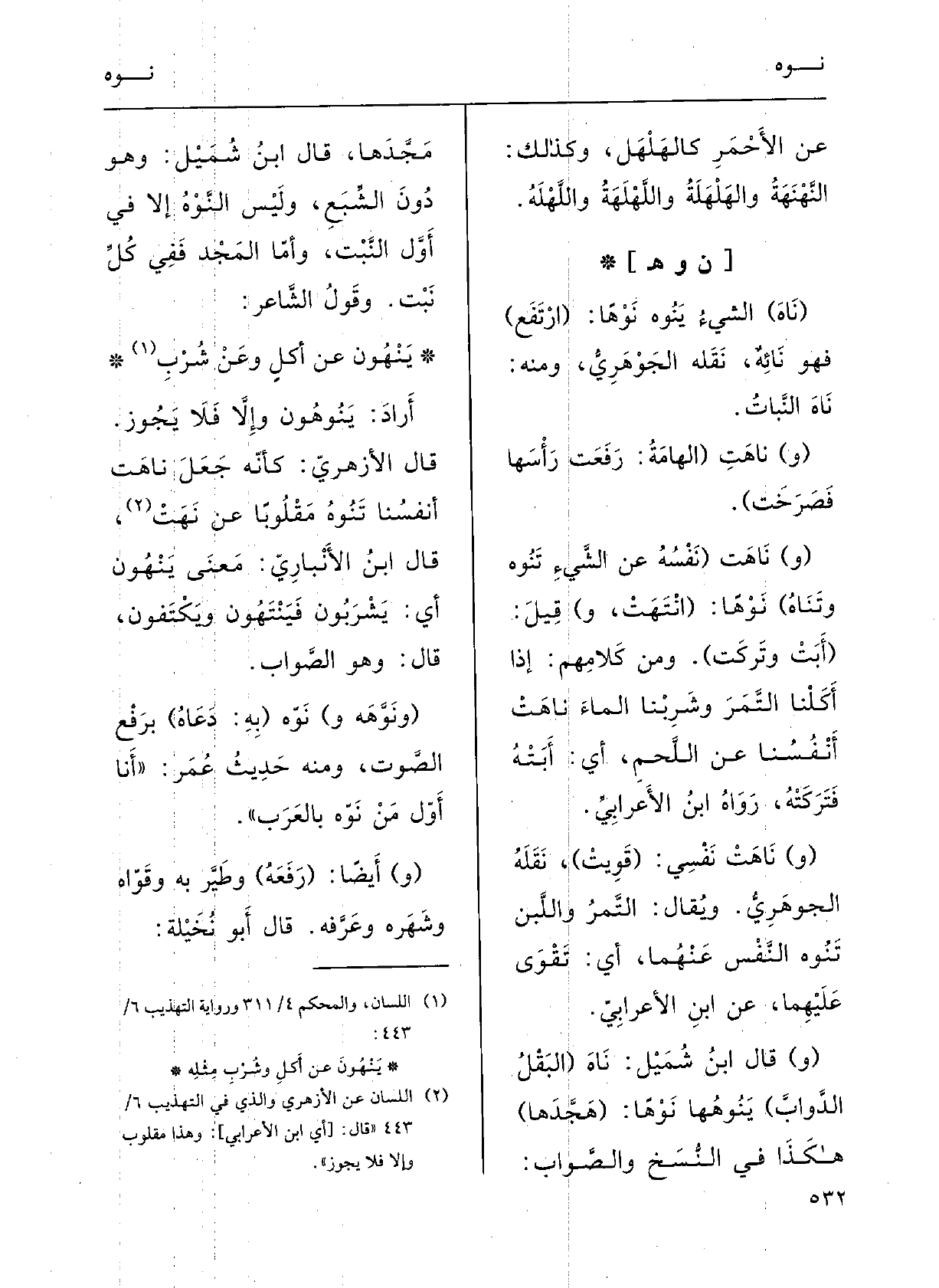 (ومِن كَلامِهِم: إِذا أَكَلْنا التَّمْرَ وشَرَبْنا الماءَ ناهَتْ أَنْفسُنا عَن اللّحْمِ، أَي أَبَتْهُ فتَرَكَتْهُ؛ رَوَاهُ ابنُ الأَعْرابيِّ.