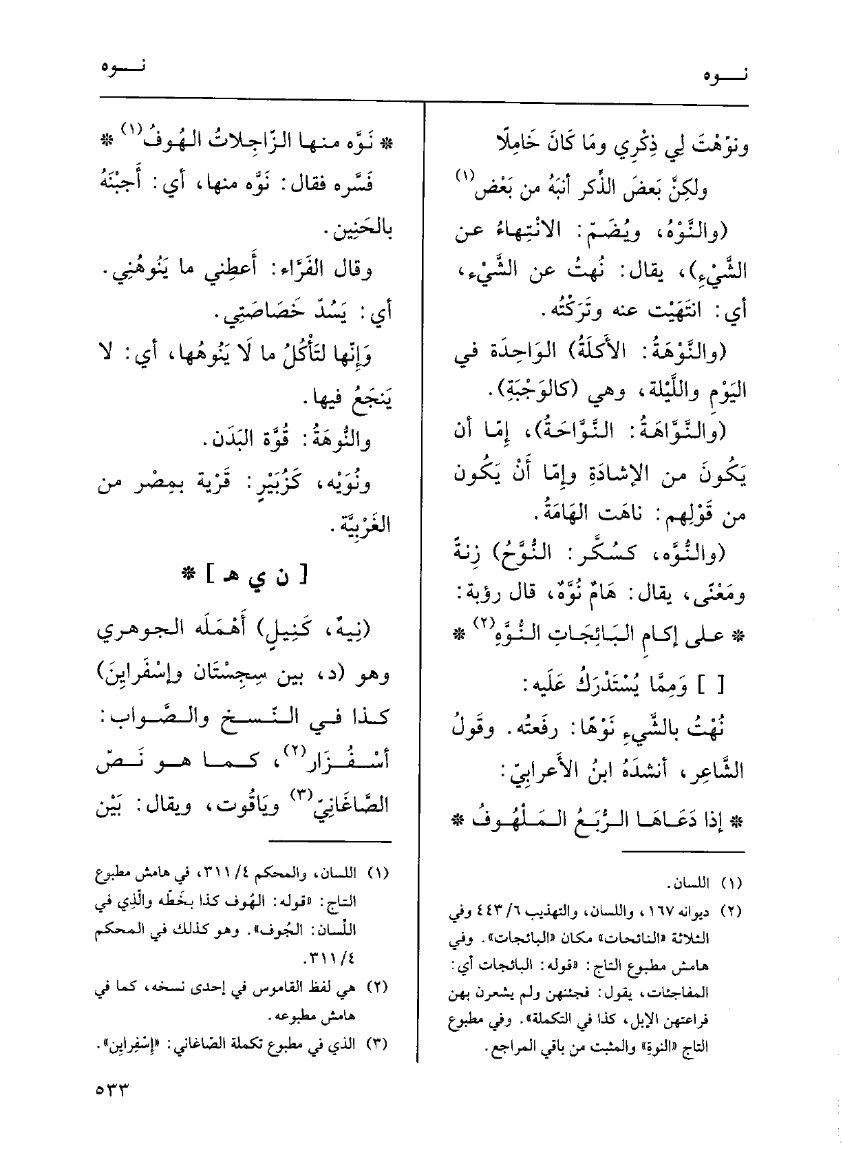 {ونَوَّهْتَ لي ذِكْرِي وَمَا كَانَ خامِلاً ولكِنَّ بَعْضَ الذِّكْرِ أَنْبَهُ من بَعْضِ (} والنَّوْهُ، ويُضَمُّ: الانْتِهاءُ عَن الشَّيءِ) .) يقالُ: {نُهْتُ عَن الشيءِ، أَي انْتَهَيْتُ عَنهُ وتَرَكْتُه.