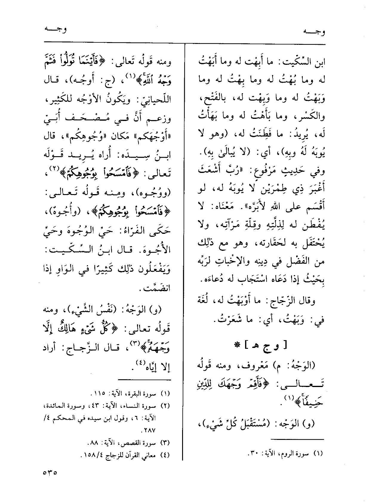 : (} الوَجْهُ: م) مَعْروفٌ؛ وَمِنْه قَوْلُه تَعَالَى: {فأَقِمْ {وَجْهَكَ للدِّيْن حَنِيفاً} .