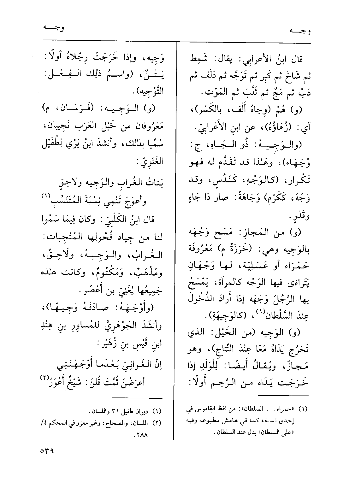 (و) الوَجِيهُ: (فَرَسانِ م) مَعْروفانِ مِن خَيْلِ العَرَبِ نَجِيبانِ سُمَّيا بذلِكَ؛ وأَنْشَدَ ابنُ بَرِّي لطُفَيْل الغَنَويّ: