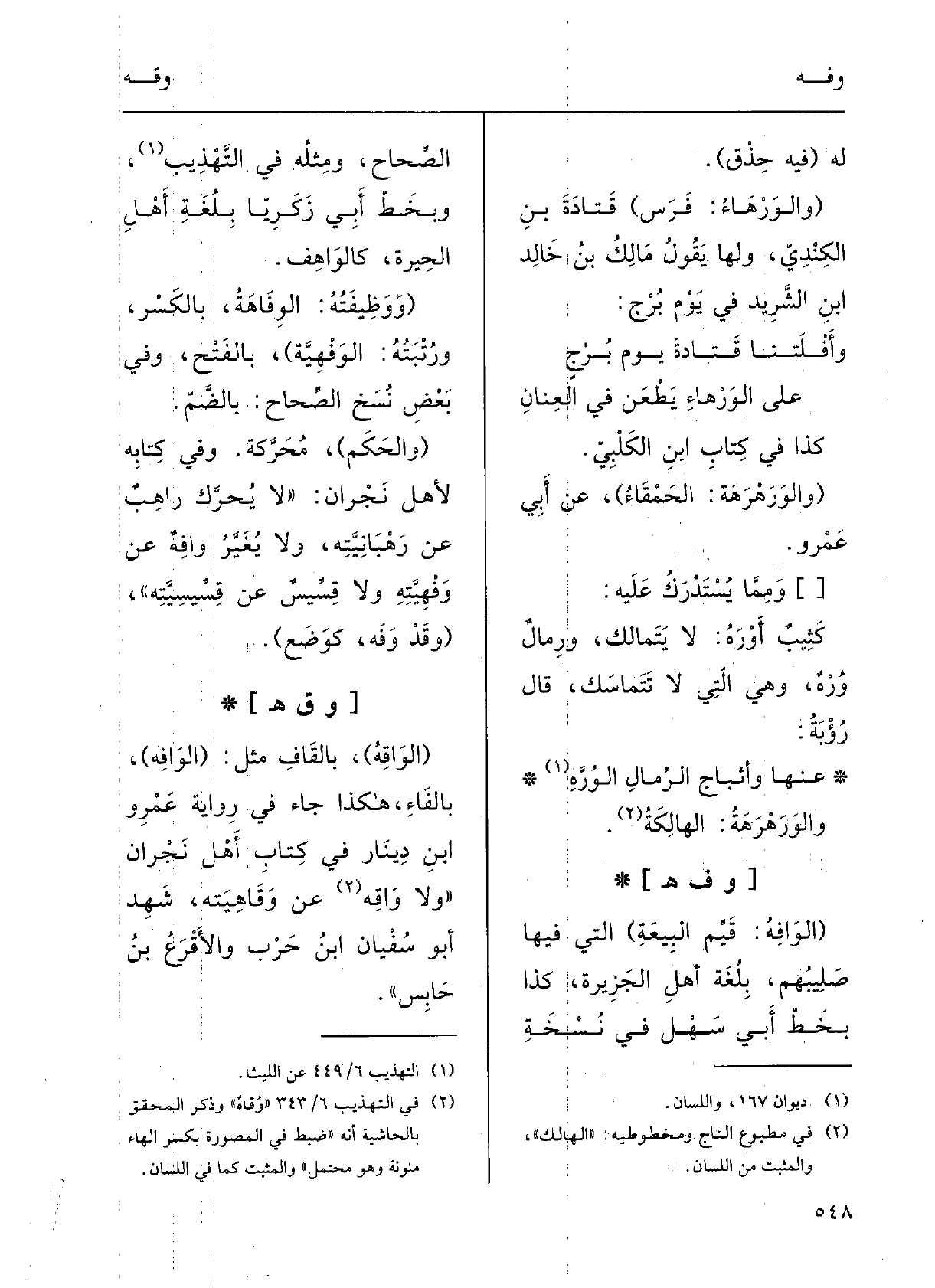 : ( {الواقِهُ) ، بالقافِ مثْلُ (الوافِهِ) بالفاءِ، هَكَذَا جاءَ فِي رِوايَةِ عَمْرو بنِ دِينارٍ فِي كتابِ أَهْلِ نَجْرانَ: (وَلَا} واقِهٌ عَن! وَقاهِيَتِه) ، شَهِدَ أَبو سُفْيان بنُ حَرْبٍ والأقْرَعُ بنُ حابِسٍ.