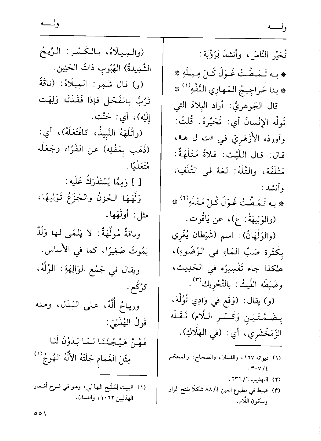 قُلْتُ: وأَوْرَدَه الأزْهرِيُّ فِي ت ل هـ، قالَ: قالَ اللَّيْثُ: فَلاةٌ مَتْلَهَةٌ: مَتْلَفَةٌ، والتَّلَهُ لُغَةٌ فِي التَّلَفِ؛ وأَنْشَدَ: