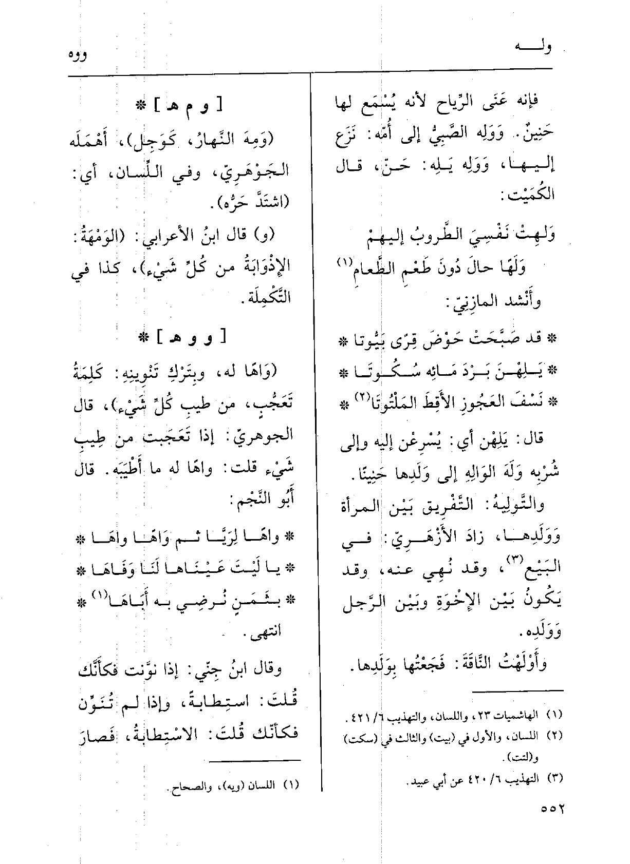 قد صَبَّحَتْ حَوْضَ قِرًى بَيُّوتاً {يَلِهْنَ بَرْدَ مائِهِ سُكُوتا نَسْفَ العجوزِ الأَقِطَ المَلْتُوتا قالَ:} يَلِهْنَ أَي يُسْرِعْنَ إِلَيْهِ وَإِلَى شرْبِه ولَهَ {الوَالِه إِلَى ولَدِها حَنِيناً.