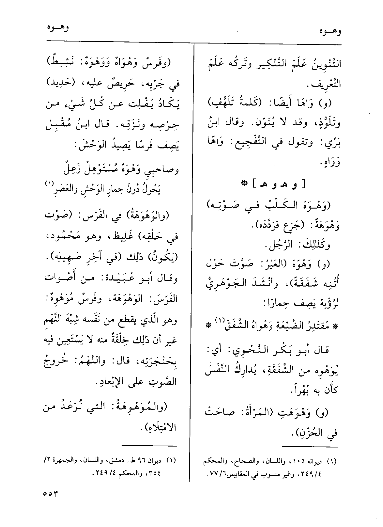 وصاحِبي} وَهْوَهٌ مُسْتَوْهِلٌ زَعِلٌ يَحُولُ دون حِمارِ الوَحْشِ والعَصَرِ ( {والوَهْوَهَةُ) فِي الفَرَسِ: (صَوْتٌ فِي حَلْقِهِ) غَلِيظٌ، وَهُوَ محمودٌ (يكونُ) ذلِكَ (فِي آخِرِ صَهِيلِهِ) .