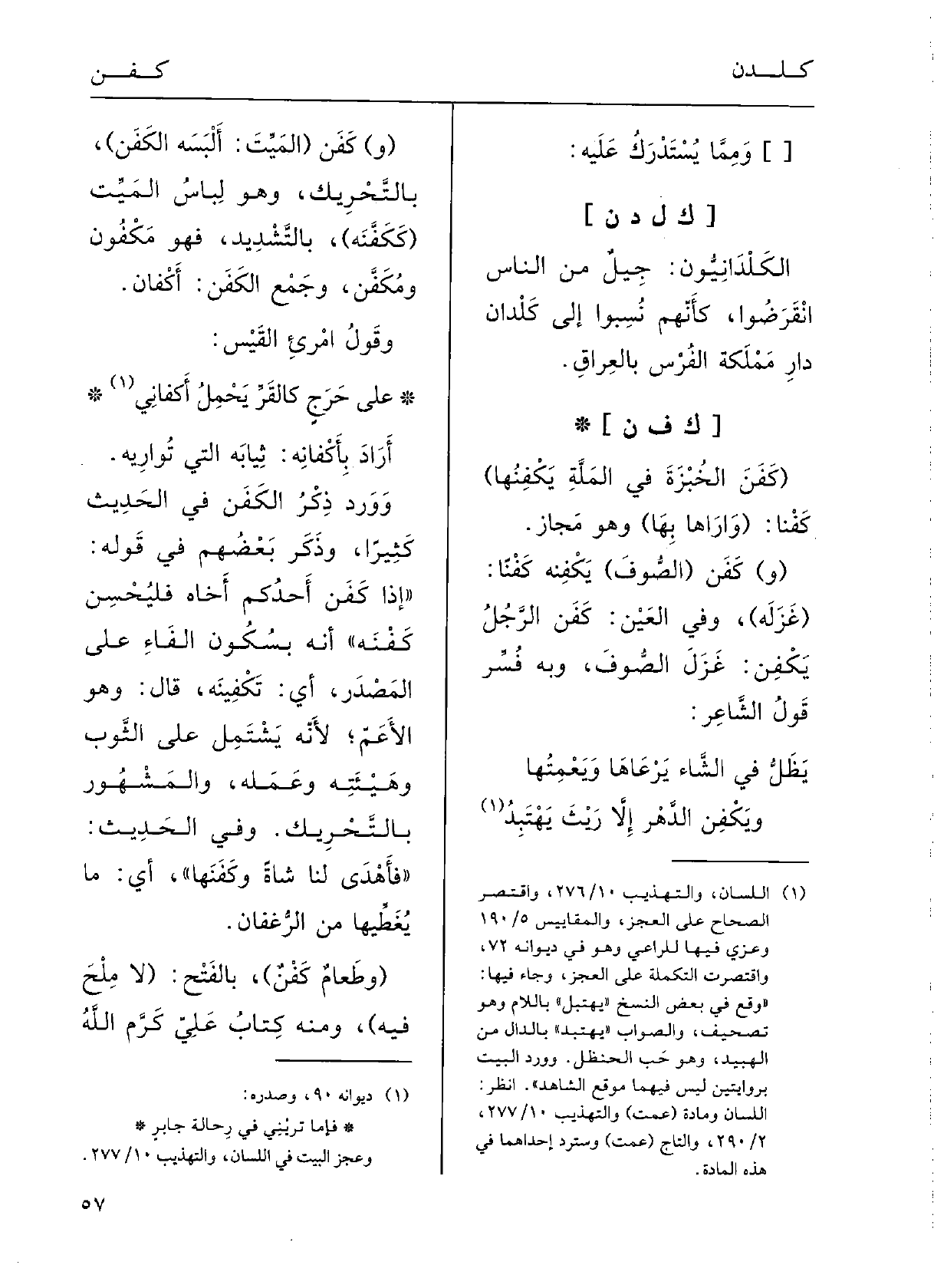 يَظَلُّ فِي الشاءِ يَرْعاها ويَعْمِتُهاويَكْفِنُ الدَّهْرَ إلاَّ رَيْثَ يَهْتَبِد (وكَفَنَ (المَيِّتَ: أَلْبَسَهُ الكَفَنَ، بالتّحْريكِ، وَهُوَ لِباسُ المَيِّتِ؛ (ككَفَّنَهُ، بالتَّشْديدِ، فَهُوَ مَكْفونٌ ومُكَفَّنٌ؛ وجَمْعُ الكَفَنِ أَكْفانٌ؛ وقولُ امْرىءِ القيْسِ: