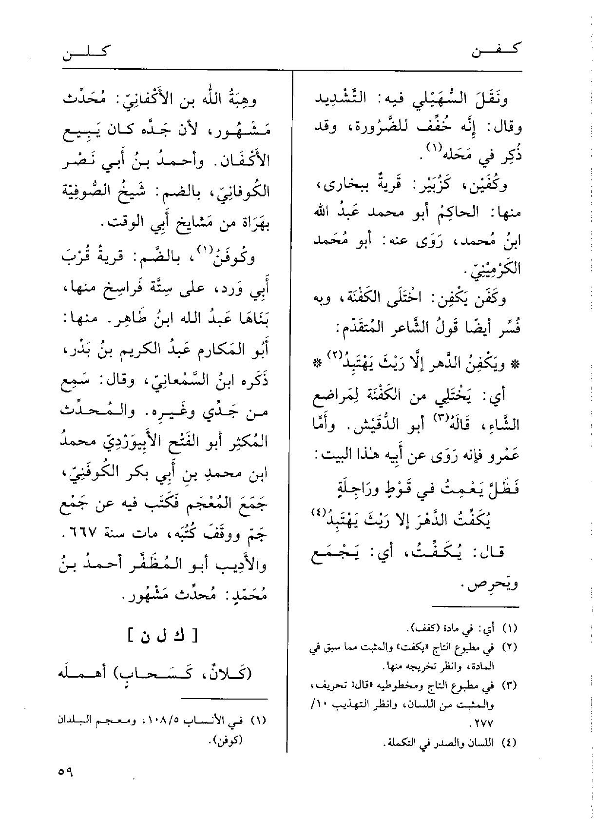 وكُوفَنُ، بالضمِّ: قَرْيةٌ قُرْبَ أَبي وَرْد على سِتَّةِ فَراسِخَ مِنْهَا، بَناها عبدُ اللهِ بنُ طاهِرٍ، مِنْهَا: أَبو المَكارِمِ عبدُ الكَريمِ بنُ بَدْرٍ، ذَكَرَه ابنُ السّمعانيّ، وقالَ: سَمِعَ من جَدِّي وغيرِهِ؛ والمحدِّثُ المُكْثِرُ أَبو الفتْح الأَبيورديّ محمدُ بنُ محمدِ بنِ أَبي بكْرٍ الكوفني جَمَع المعْجَم فكَتَبَ فِيهِ عَن جَمْعٍ جمَ ووَقَفَ كُتُبَه، ماتَ سَنَة 667؛ والأَدِيبُ أَبو المُظَفّر أَحمدُ بنُ محمدٍ مُحدِّثٌ مَشْهورٌ.