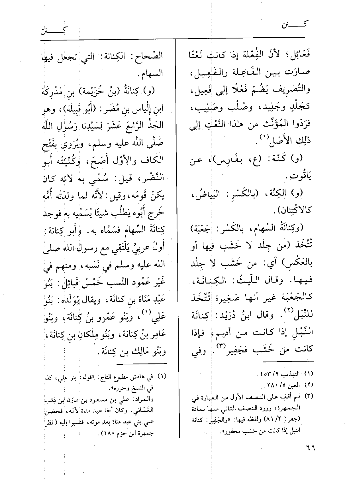 (وكِنانَةُ (بنُ خُزَيْمَةَ بنِ مُدْرِكَةَ بنِ إلياسِ بنِ مُضَر: (أَبو قَبيلَةٍ، وَهُوَ الجَدُّ الرابعُ عَشَر لسيِّدِنا رسُول اللهِ، صلى الله عَلَيْهِ وَسلم ويُرْوَى بفتْحِ الكافِ، والأَوَّل أَصَحُّ، وكُنْيَتُه أَبو النَّضْر؛ قيلَ: سُمِّي بِهِ لأنَّه كانَ يَكنُّ قَوْمَه؛ وقيلَ: لأنَّه لمَّا وَلَدَتْه أُمّه خَرَجَ أَبُوه يَطْلُبُ شَيْئا يُسَمِّيه بِهِ فوَجَدَ كِنانَةَ السِّهامِ فسَمَّاه بِهِ، وأَبو كِنانَةَ أَوَّلُ عَرَبيَ يَلْتَقِي مَعَ رسُولِ اللهِ، صلى الله عَلَيْهِ وَسلم فِي نَسَبِه، وَمِنْهُم فِي غيرِ عَمُودِ النّسَبِ خَمْسُ قَبائِل؛ بنُو عبْدِ مَنَاة بنِ كِنانَةَ، ويقالُ لولدِه بنُو عليَ، وبنُو عَمْرِو بنِ كِنانَةَ، وبنُو عامِرِ بنِ كِنانَةَ، وبنُو ملْكَان بنِ كِنانَةَ، وبنُو مالِكِ بنِ كِنانَةَ.