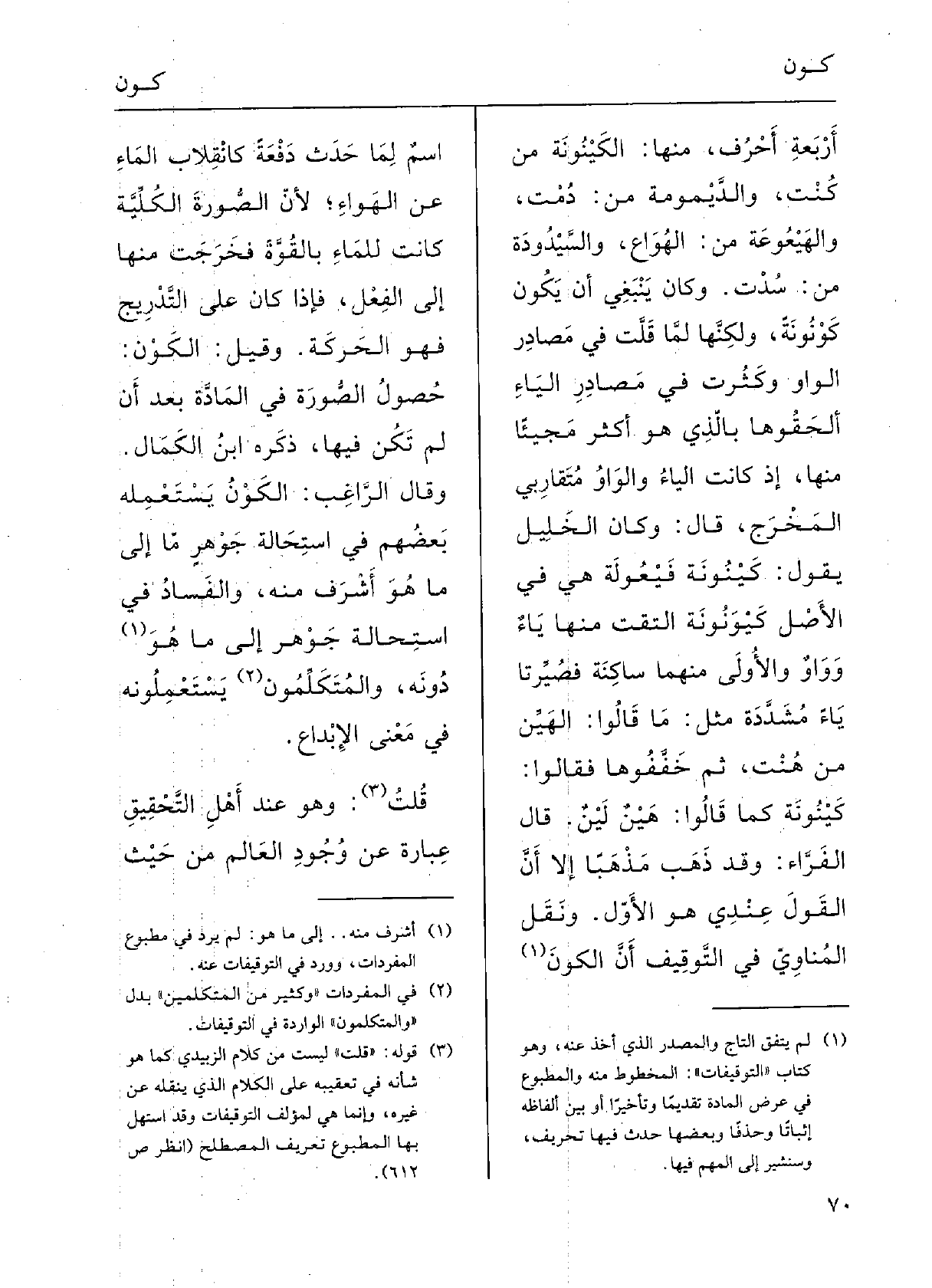 ونَقَلَ المَناوِي فِي التَّوْقِيف: أَنَّ} الكَوْنَ اسمٌ لمَا حَدَثَ دفْعَةً كانْقِلابِ الماءِ عَن الهَواءِ، لأنَّ الصُّورَةَ الكُلِّيةَ كانتْ للماءِ بالقوَّةِ فخرَجَتْ مِنْهَا إِلَى الفِعْلِ، فَإِذا كانَ على التَّدْريجِ فَهُوَ الحركَةُ، وقيلَ: الكَوْنُ حُصُولُ الصُّورةِ فِي المادَّةِ بعْدَ أَنْ لم تكنْ فِيهَا؛ ذَكَرَه ابنُ الكَمالِ.
