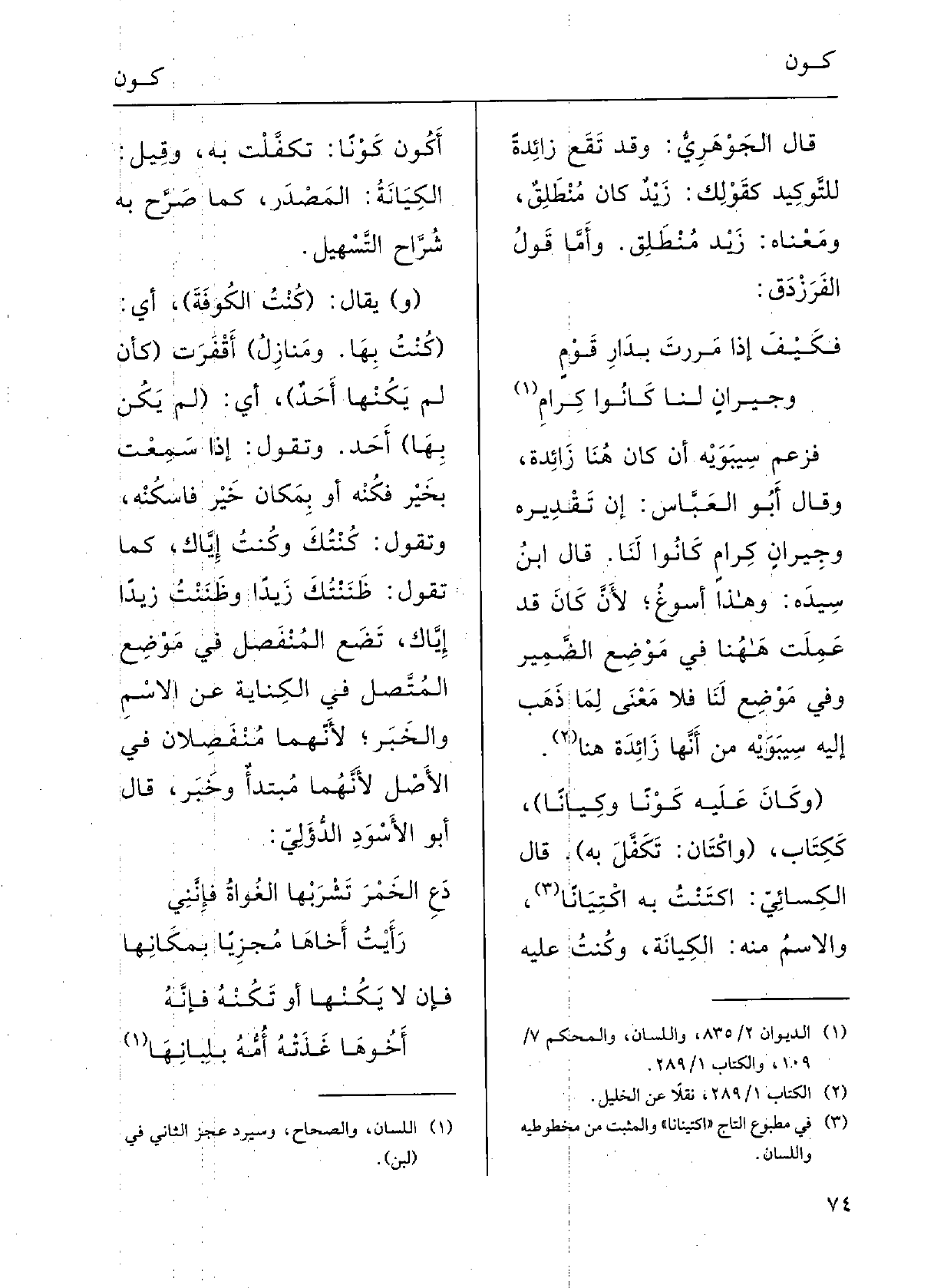فكيفَ إِذا مَرَرْتَ بدارِ قَوْمٍ وجيرانٍ لنا {كانُوا كِرامِ؟ فزَعَمَ سِيبَوَيْه أَنَّ كانَ هُنَا زائِدَةٌ.