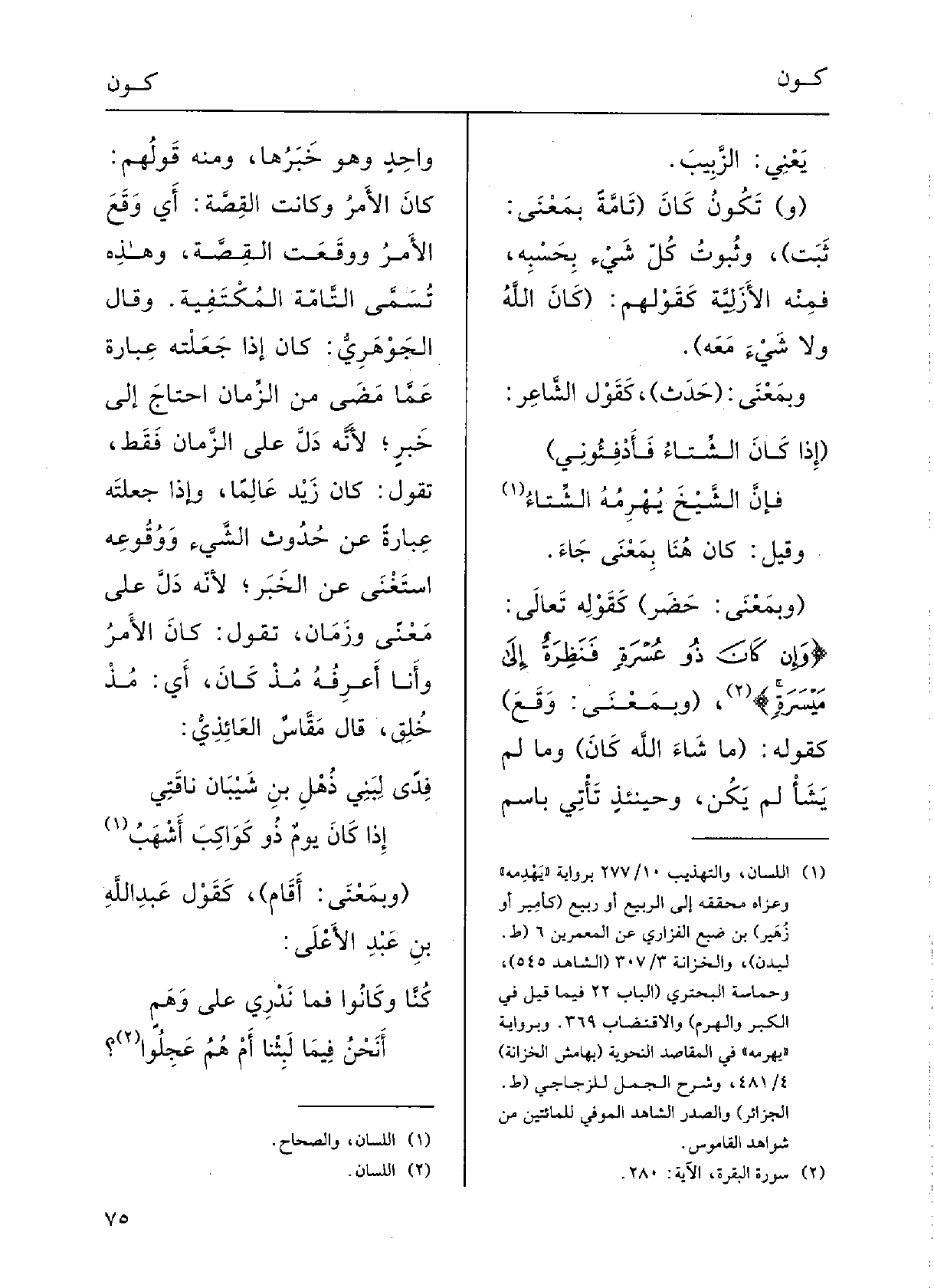 (وبمَعْنَى حَضَرَ: كقَوْلِهِ تعالَى: {وَإِن كانَ ذُو عُسْرَةٍ} فنَظْرَة إِلَى مَيْسرة (وبمَعْنَى وَقَعَ: كقَوْلِه: (مَا شاءَ اللهُ كانَ وَمَا لم يَشَأْ لم} يَكُنْ: وحينَئِذٍ تأْتي باسمٍ واحِدٍ وَهُوَ خَبَرُ؛ وَمِنْه قَوْلُهم: كانَ الأَمْرُ القصَّةُ، أَي وَقَع الأمْرُ ووَقَعَتِ القصَّةُ، وَهَذِه تُسَمَّى التامَّة المُكْتَفِيَة.