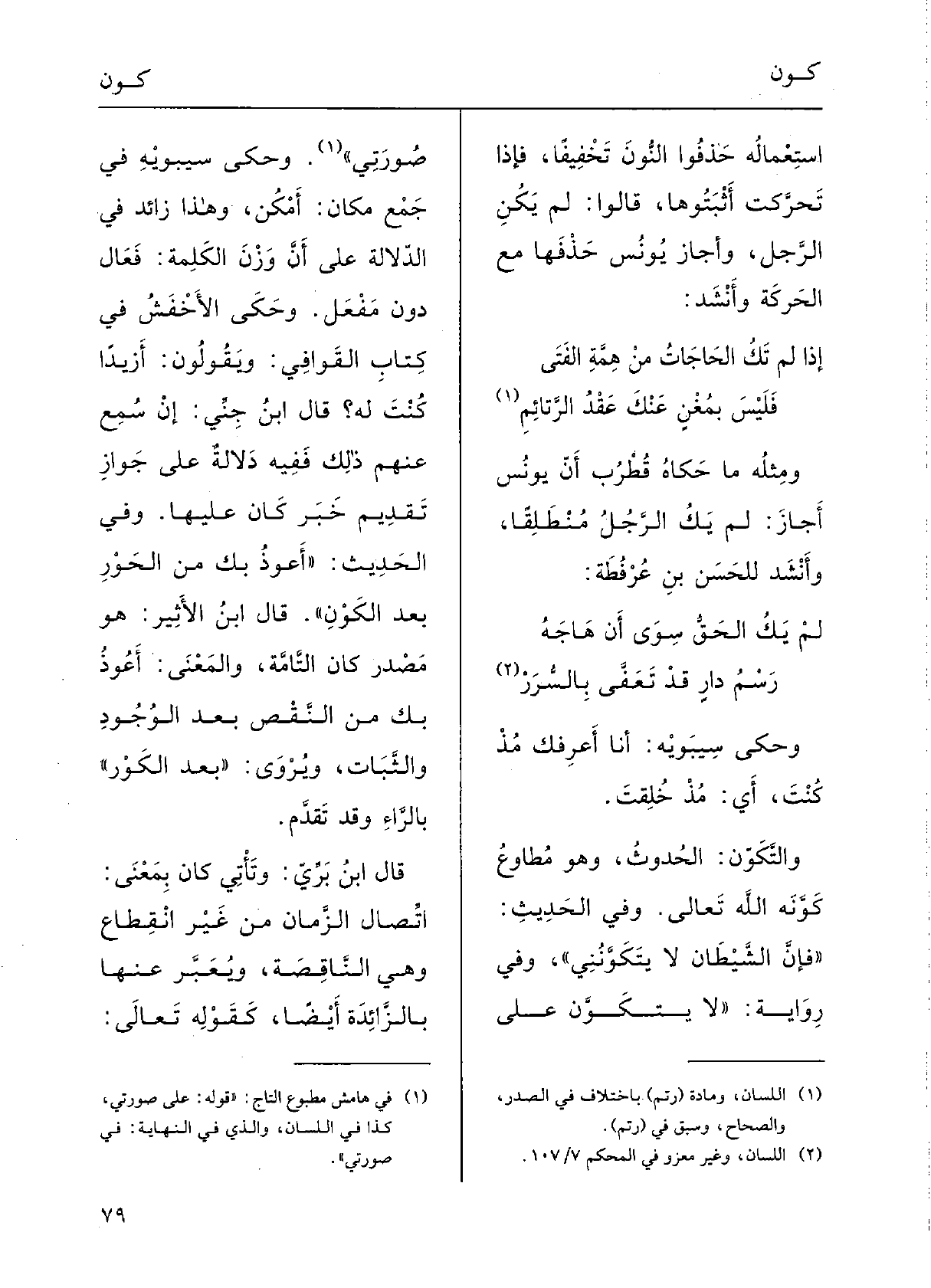لم يَكُ لحق سوى أَنْ هَاجَهُرَسْمُ دارٍ قد تَعَفَّى بالسَّرَرْوحَكَى سِيبَوَيْه: أَنا أَعْرِفُكَ مُذْ {كُنْتَ، أَي مُذْ خُلِقْتَ،} والتَّكَوُّنُ؛ الحُدُوثُ، وَهُوَ مُطاوِعُ {كَوَّنَه اللهُ تَعَالَى؛ وَفِي الحدِيثِ: (فإنَّ الشَّيْطانَ لَا} يَتَكَوَّنُني) ؛ وَفِي رِوايَةٍ: لَا! يَتَكَوَّنُ على صُورَتِي.