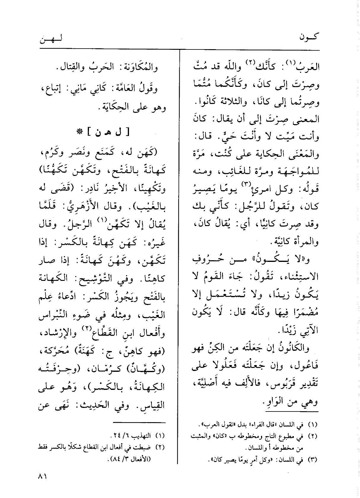 العَرَبُ: كأَنَّك واللهُ قد مُتَّ وصِرْتَ إِلَى كانَ، وكأَنَّكما مُتُّما وصِرْتُما إِلَى {كانَا، وللثلاثَةِ} كَانُوا: المعْنَى صِرْتَ إِلَى أَنْ يقالَ كانَ وأَنْتَ ميتٌ لَا وأَنْتَ حَيٌّ؛ قالَ: والمعْنَى الحِكايَةُ على كُنْت مَرَّةً للمُواجَهَةِ ومَرَّةً للغائِبِ؛ وَمِنْه قَوْلُه: وكلُّ امْرىءٍ يَوْمًا يَصِيرُ كانَ. وتقولُ للرَّجُلِ: كأَنِّي بكَ وَقد، صِرْتَ {كانِيّاً، أَي يقالُ كانَ والمرْأَة} كانِيَّة، وَلَا يكونُ مِن حُرُوفِ الاسْتِثناءِ، تقولُ: جاءَ القَوْمُ لَا يكونُ زَيْداً، وَلَا تُسْتَعْمل إلاَّ مُضْمراً فِيهَا، وكأنَّه قالَ: لَا يكونُ الْآتِي زَيْداً.