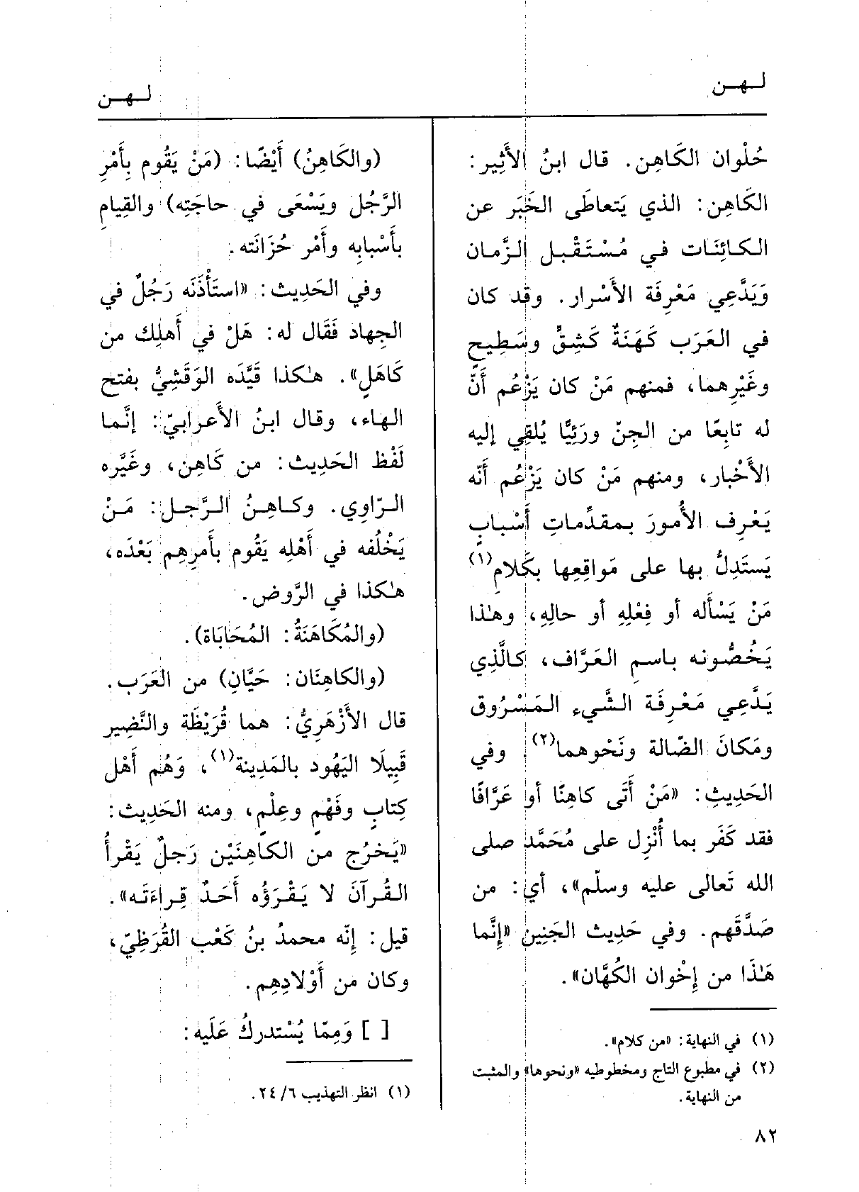 حُلْوانِ الكاهِنِ) ؛ قالَ ابنُ الأثيرِ: الكاهِنُ الَّذِي يَتَعاطَى الخبَرَ عَن الكَائِناتِ فِي مُسْتقبلِ الزَّمانِ، ويَدَّعِي مَعْرفَةَ الأَسْرارِ، وَقد كانَ فِي العَرَبِ كَهَنةٌ كشِقَ وسَطِيحٍ وغيرِهِما، فَمنهمْ مَنْ كانَ يَزْعُم أَنَّ لَهُ تابِعاً مِنَ الجِنِّ ورَئِيّاً يُلْقي إِلَيْهِ الأَخْبار، وَمِنْهُم مَنْ كانَ يَزْعُم أَنَّه يَعْرِفُ الأُمورَ بمُقدِّمات أَسْبابٍ يستدلُّ بهَا على مَواقِعِها بكَلامِ مَنْ يَسْأَله أَو فِعْله أَو حَالَه، وَهَذَا يخُصُّونَه باسمِ العَرَّافِ كَالَّذي يَدَّعِي مَعْرِفَةَ الشيءِ المَسْروقِ ومَكَان الضَّالَّةِ ونَحْوِها.