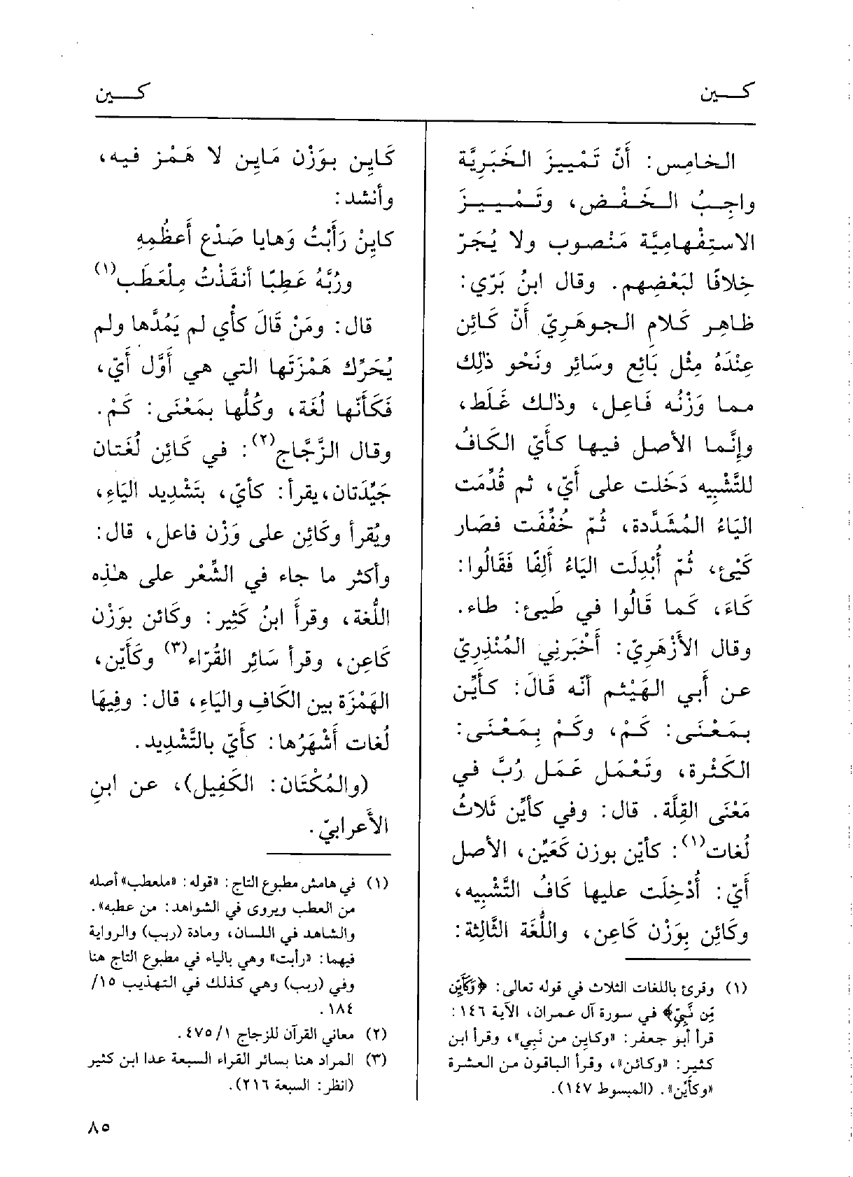 وقالَ الزَجَّاجُ: فِي كائِنْ لُغَتانِ جَيِّدتانِ يُقْرَأُ كَأَيَ بتَشْديدِ الياءِ، ويُقْرأُ وكائِنْ على وَزْنِ فاعِلٍ، قالَ: وأَكْثَرُ مَا جاءَ فِي الشِّعْرِ على هَذِه اللّغَةِ، وقَرَأَ ابنُ كثيرٍ وكائِنُ بوَزْنِ كاعِنُ، وقَرَأَ سائِرُ القُرّاءِ وكأَيِّنْ، الهَمْزَةُ بينَ الكافِ والياءِ، قالَ: وفيهَا لُغاتٌ أَشْهَرُها كأَيَ بالتَّشْديدِ.
