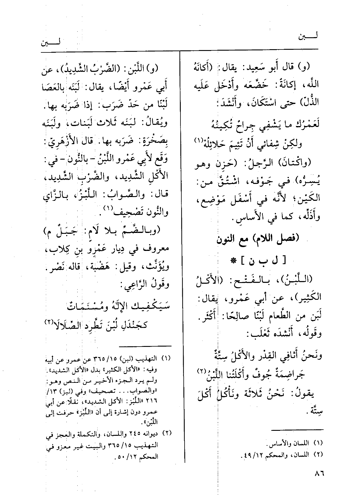 قالَ الأزْهرِيُّ: وَقَعَ لأبي عَمْرٍ واللَّبْنُ، بالنونِ، فِي الأَكْلِ الشَّديدِ والضَّرْبِ الشَّديدِ، قالَ: والصَّوابُ اللَّبْزُ، بالزّاي، والنونُ تَصْحيفٌ.