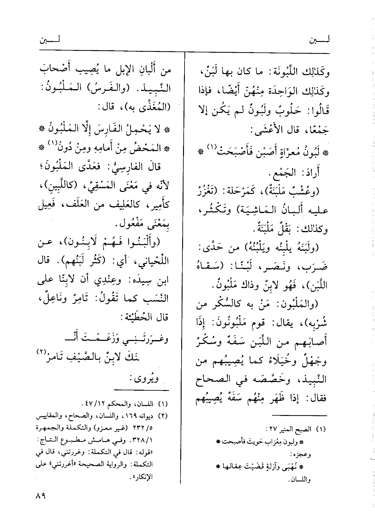 (قالَ ابنُ سِيْدَه: وعنْدِي أنَّ لابِناً على النَّسَبِ كَمَا تَقولُ: تامِرٌ وناعِلٌ؛ قالَ الحُطَيْئة: