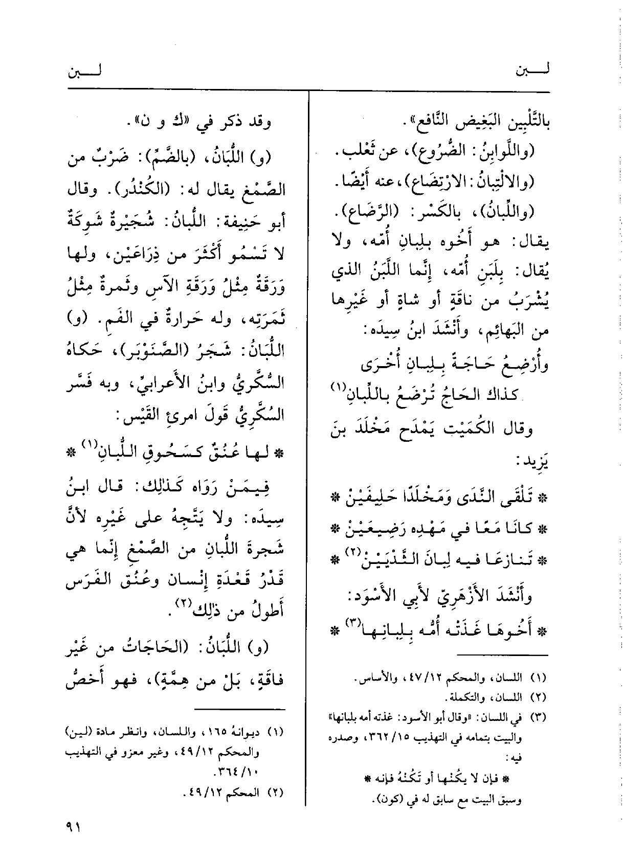 (واللِّبَانُ) ، بالكسْرِ: (الرَّضاعُ) .) يقالُ: هُوَ أَخُوه بلِبَانِ أُمِّه، وَلَا يقالُ بلَبَنِ أُمِّه، إنَّما اللَّبَنُ الَّذِي يُشْرَبُ من ناقَةٍ أَو شاةٍ أَو غيرِها مِن البَهائِمِ؛ وأَنْشَدَ ابنُ سِيْدَه: