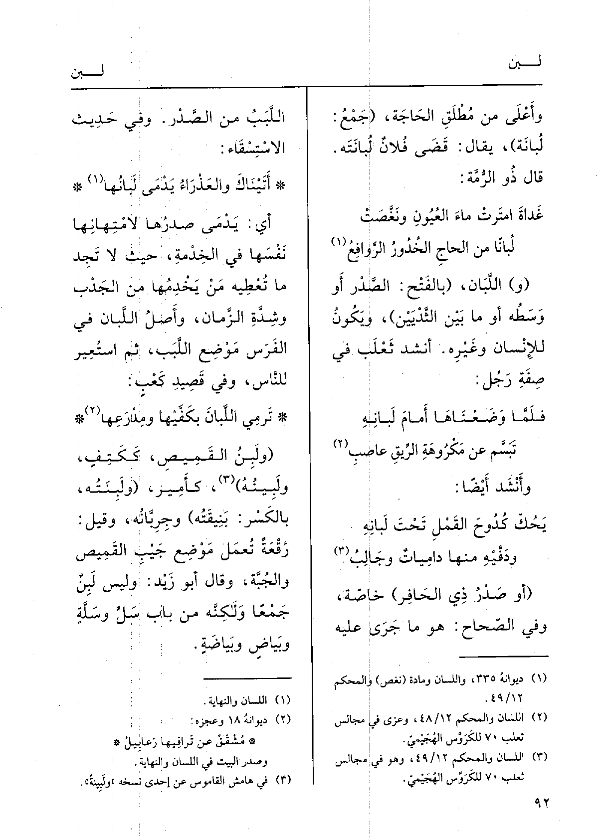 غَداةَ امْتَرَتْ ماءَ العُيونِ ونغَّصتْلُباناً مِن الحاجِ الخُدُورُ الرَّوافِعُ (و) اللَّبَانُ، (بالفَتْحِ: الصَّدْرُ أَو وَسَطُه أَو مَا بينَ الثَّدْيَيْنِ) ، ويكونُ للإنْسانِ وغيرِهِ؛ أَنْشَدَ ثَعْلَب فِي صفَةِ رجُلٍ: