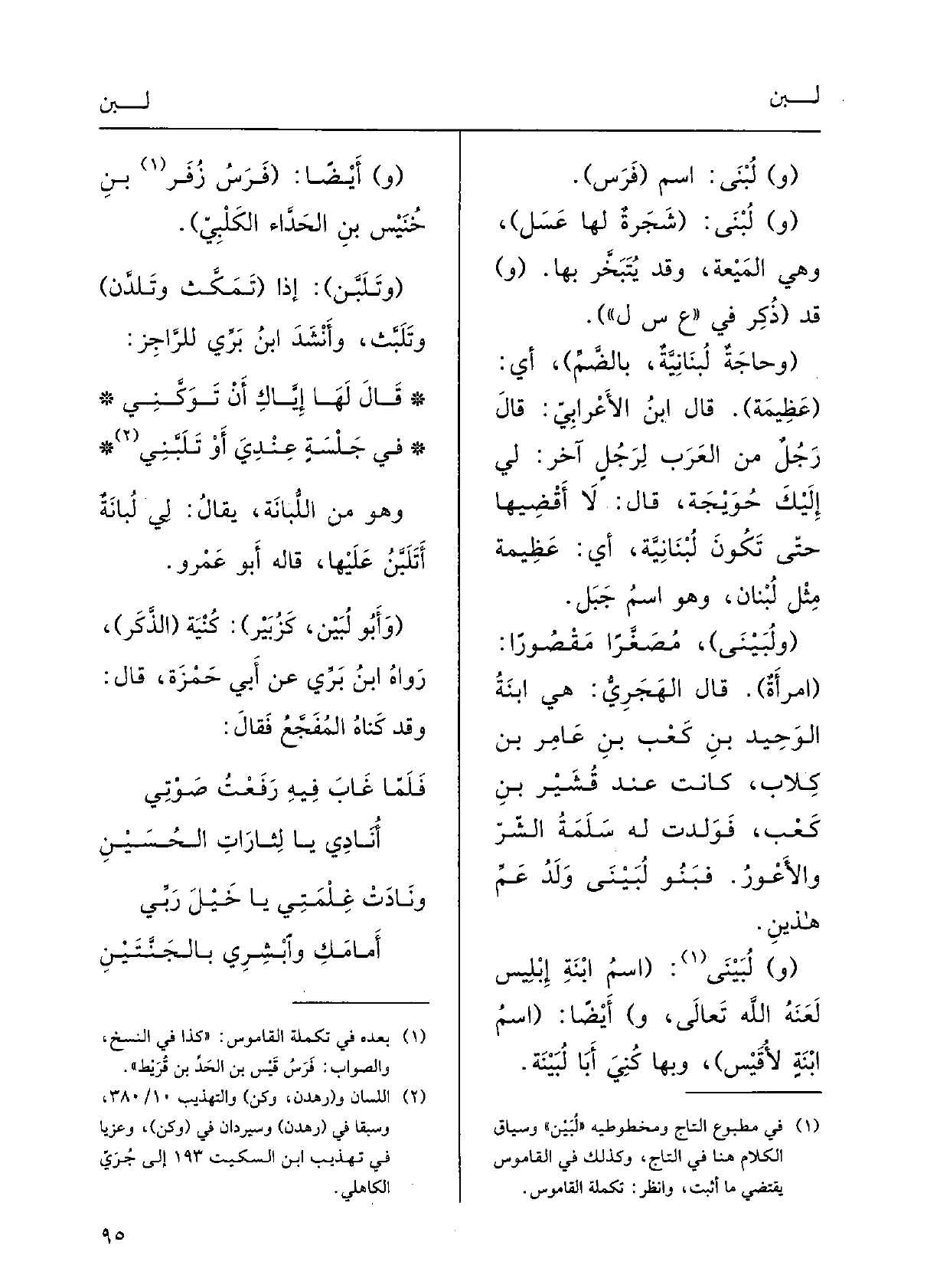 (و) لُبَيْن: (اسمُ ابْنَةِ إِبْلِيس، لَعَنَهُ اللَّهُ تَعَالَى.