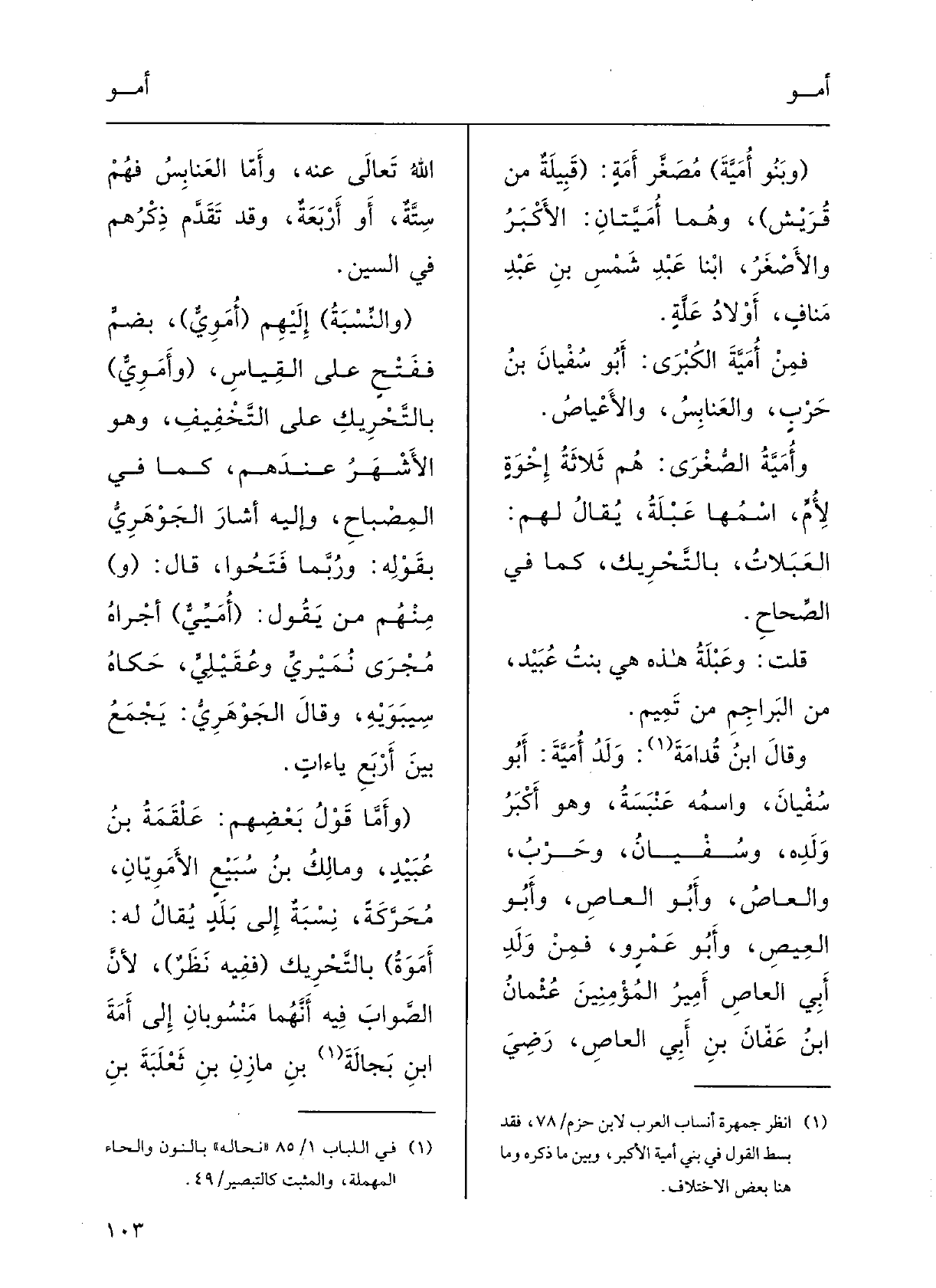 وقالَ ابنُ قدامَةَ: وَلَدَ أَمَيَّة أَبا سُفْيان واسْمُه عَنْبَسَة وَهُوَ أَكْبَر ولدِه، وسُفْيان وحَرْب وَالْعَاص وأَبو العاصِ وأَبو الْعيص وأَبو عَمْرو؛ فَمن ولِد أَبي العاصِ أَمِيرُ المُؤْمِنِين عُثْمانُ بنُ عَفَّان بنِ أَبي العاصِ، رضِيَ اللَّهُ تَعَالَى عَنهُ، وأَمَّا العَنابِسُ فهُم ستَّة أَو أَرْبَعَة وَقد تقدَّمَ ذِكْرُهم فِي السِّين.
