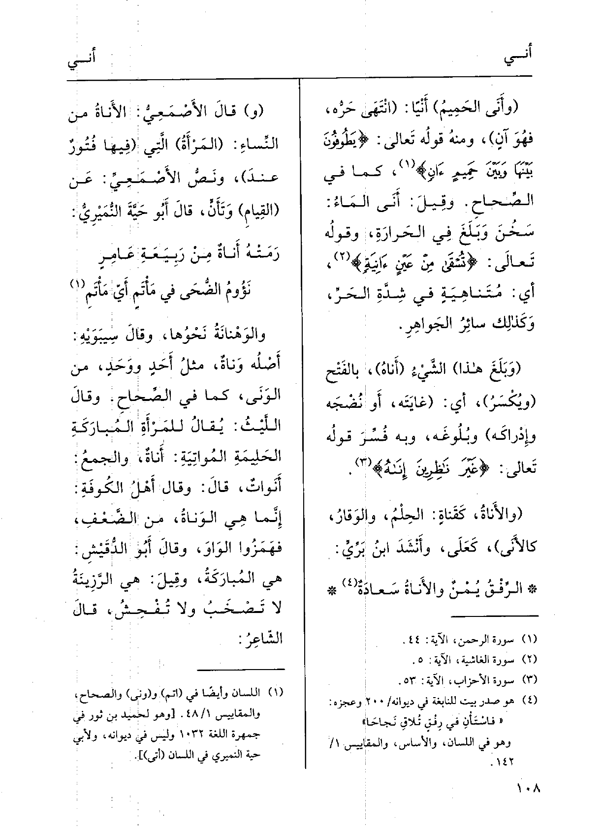 وقيلَ: أَنَى الماءُ: سَخُنَ وبلغَ فِي الحرَارَةِ؛ وقوْلُه تَعَالَى: {تُسْقَى مِن عينٍ} آنِيَةٍ} ، أَي مُتناهِيَةٍ فِي شدَّة الحرِّ؛ وكذلِكَ سائِرُ الجواهِر (وبَلَغَ هَذَا) الشَّيءُ ( {أَناهُ) ، بالفتْحِ (ويُكْسَرُ) : أَي (غايَتَهُ، أَو نُضْجَهُ وإِدراكَهُ) وبلوغَهُ؛ وَبِه فُسِّرَ قَوْله تَعَالَى: {غَيْر ناظِرينَ إناهُ} .