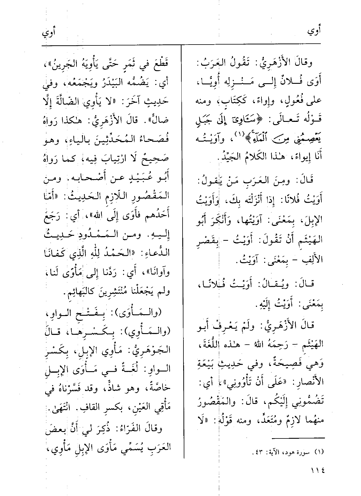 وقالَ الأزْهرُيُّ: تقولُ العَرَبُ: أَوَى فُلانٌ إِلَى مَنْزلِهِ {أَوْيّاً، على فُعولٍ، وإِواءً، ككِتابٍ؛ وَمِنْه قَوْلُه تَعَالَى: {} سآوِي إِلَى جَبَلٍ يَعْصمُني مِن الماءِ} ، {وآوَيْتُه أَنا} إِيواءً، هَذَا الكَلامُ الجيِّدُ. قالَ: ومِن العَرَبِ مَنْ يقولُ: أَوَيْتُ فُلاناً إِذا أَنْزَلْته بكَ.