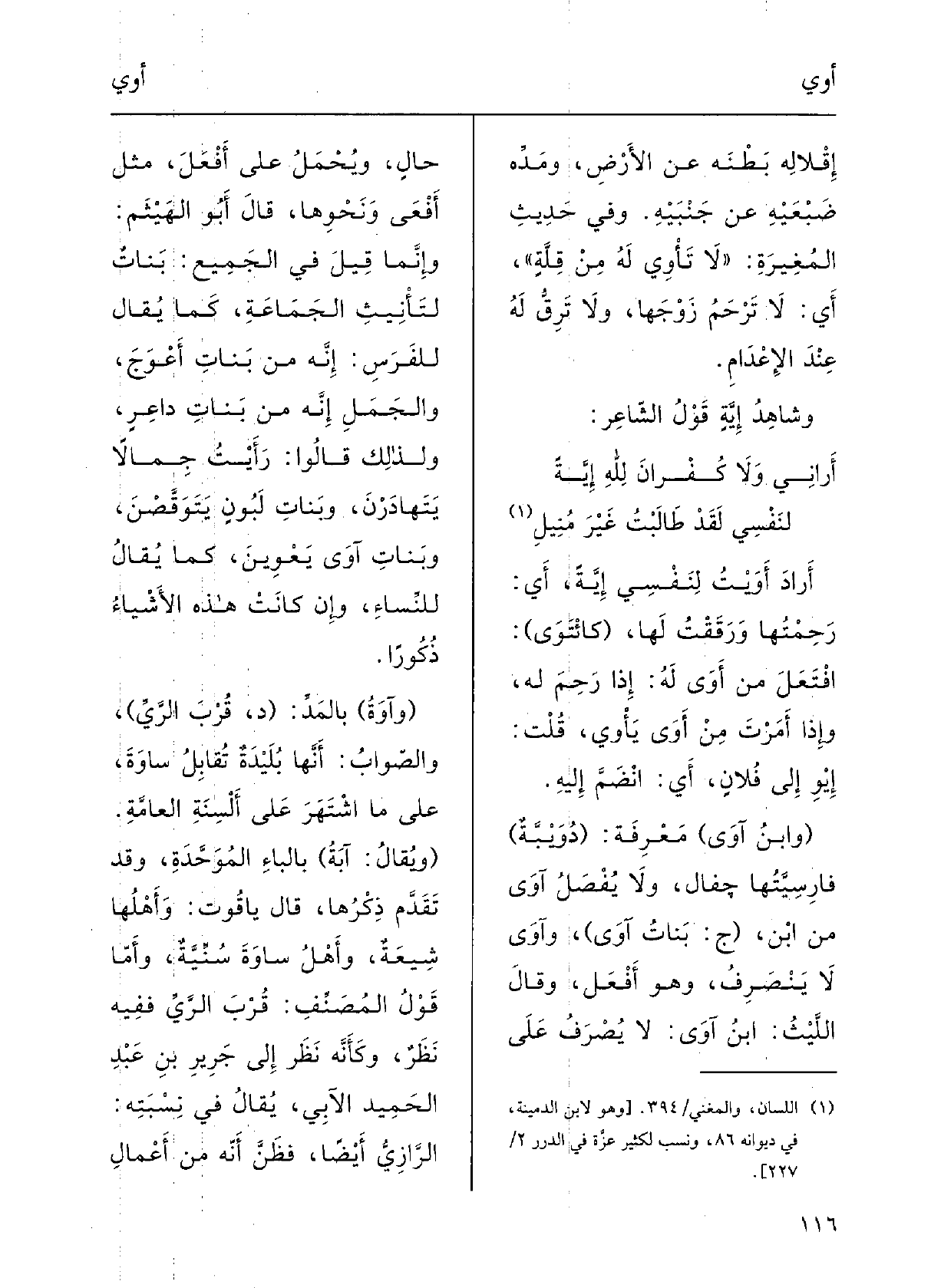 وَفِي حدِيث الْمُغيرَة: (لَا {تَأْوِي لَهُ من قلَّة) ، أَي لَا تَرْحَمُ زَوْجها وَلَا تَرِقُّ لَهُ عنْدَ الإعْدامِ؛ وشاهِدُ} إِيَّةً، قَوْلُ الشاعِرِ: