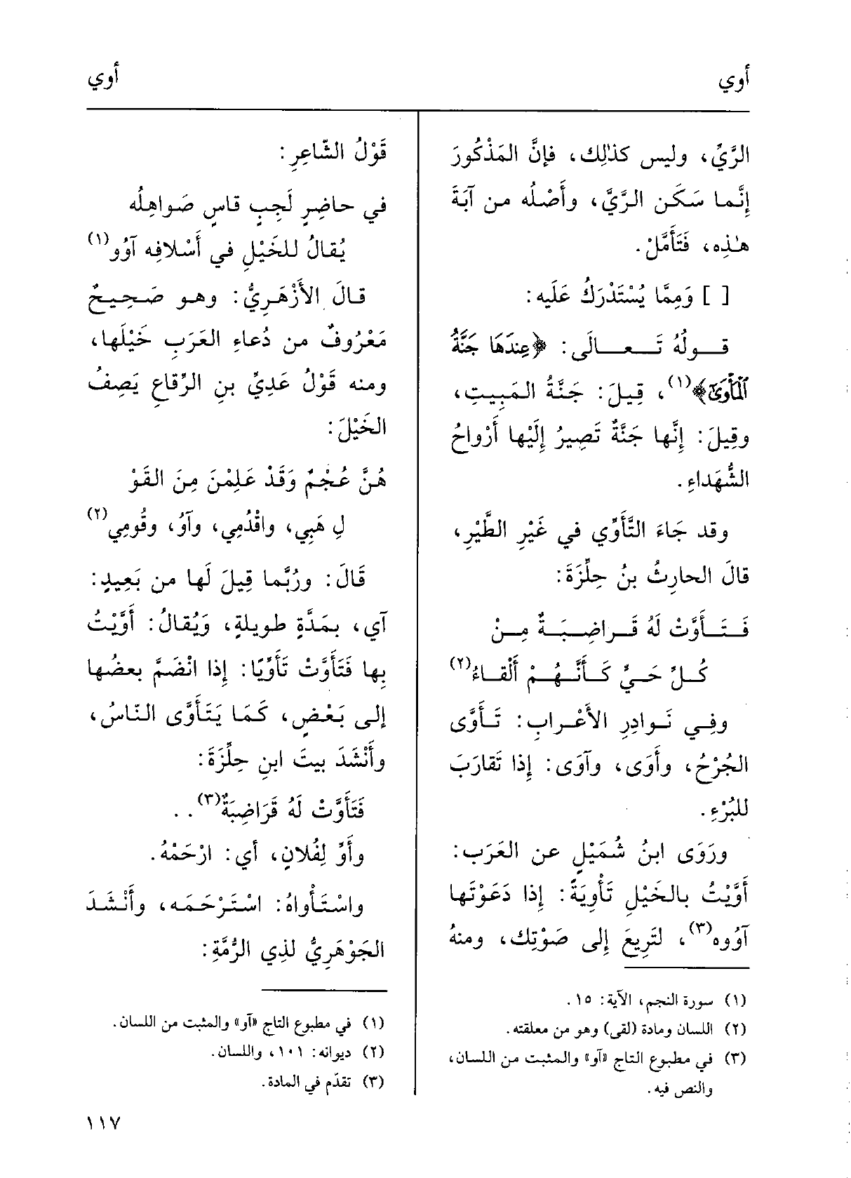ويقالُ: أَوَّيْتُ بهَا {فتَأَوَّتْ} تَأوِّيّاً إِذا انْضمَّ بعضُها إِلَى بعضٍ كَمَا {يَتَأَوَّى الناسُ؛ وأَنْشَدَ بيتَ ابنِ حِلِّزة: